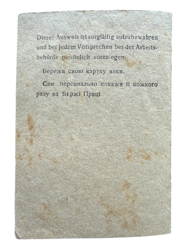 Original WWII German Meldekarte Arbeitsbehörde Charkow
