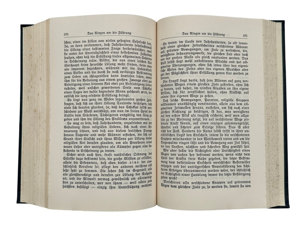 Original example of Mein Kampf by Adolf Hitler, in a classic dark blue cloth binding with gilt stamping on the spine and front cover. This edition is a German-language printing from 1939 (464th–468th edition), published by Zentralverlag der NSDAP, Franz Eher Nachf., Munich. The book includes the well-known title page with Hitler’s portrait and is complete with table of contents and publisher’s page.