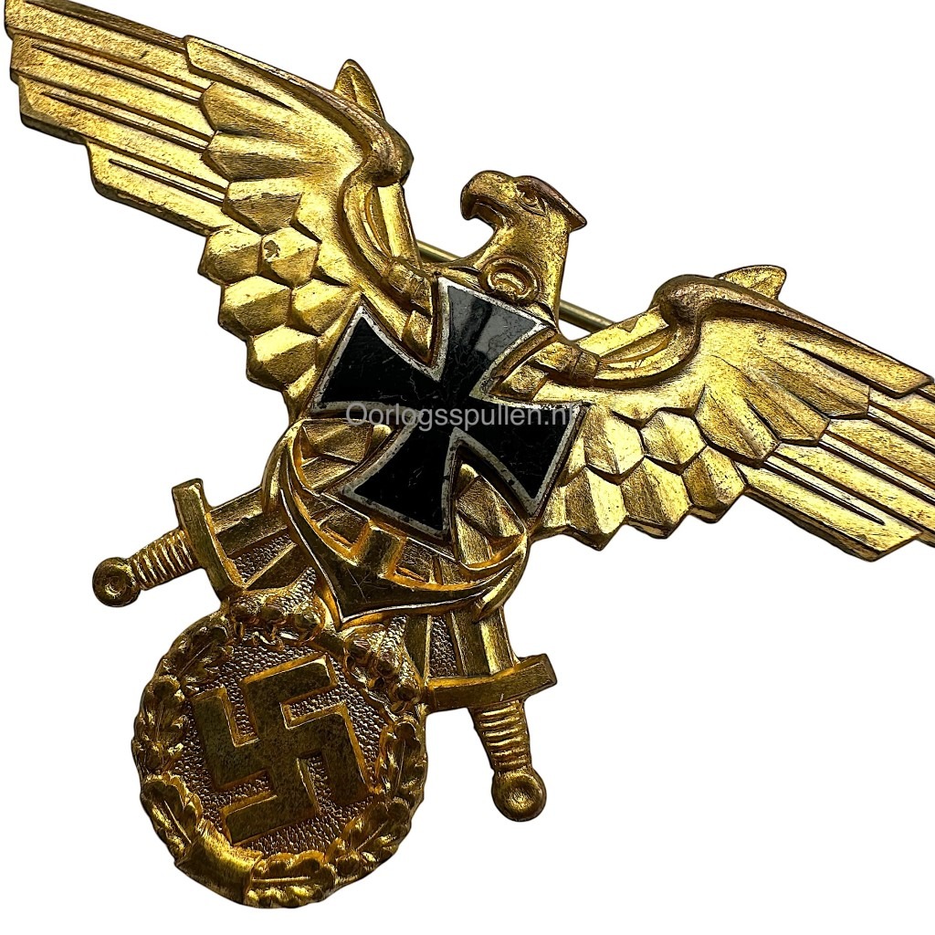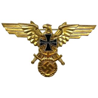 This gold colored German breast eagle is in good condition, complete with functional pin on the reverse and was worn by the NS-Marine Soldatenbund during World War II.