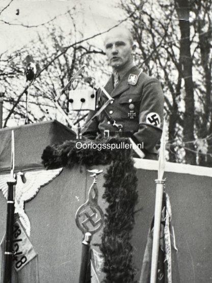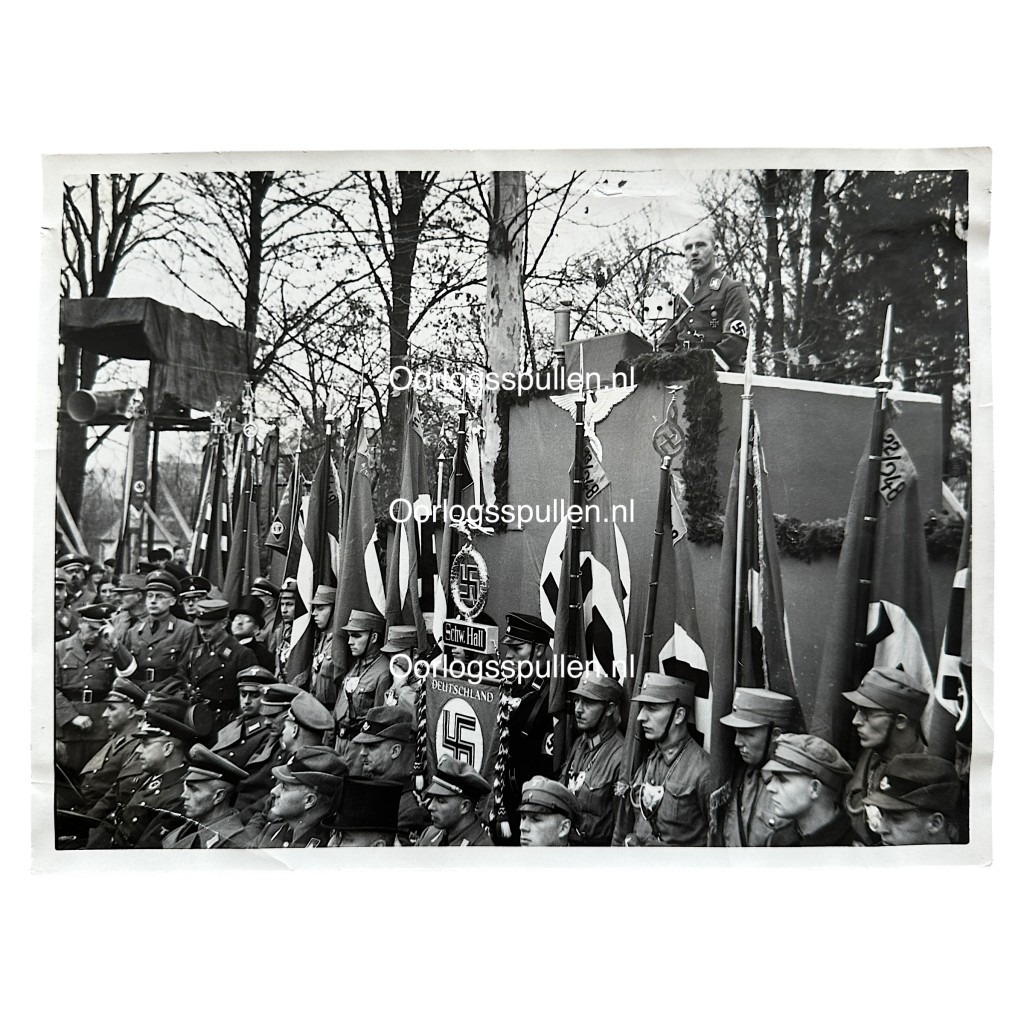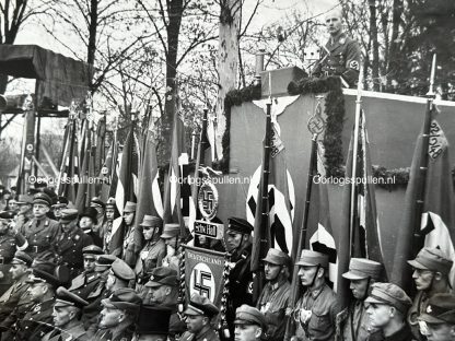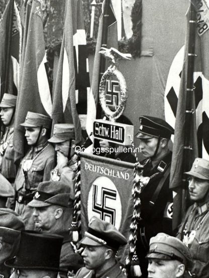 Deze Duitse groot formaat foto is in goede conditie en daarop zijn allerlei NSDAP en SS leden op te zien en de Deutschland Erwache Stadard of Schw.Hall.