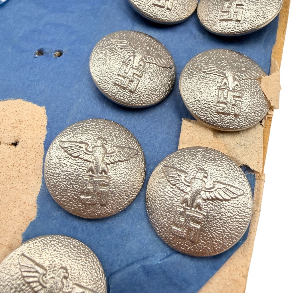 Het betreft 7 zilverkleurige metalen uniformknopen met het bekende adelaar- en hakenkruisreliëf, nog bevestigd op het oorspronkelijke (deels verweerde) presentatiekarton.