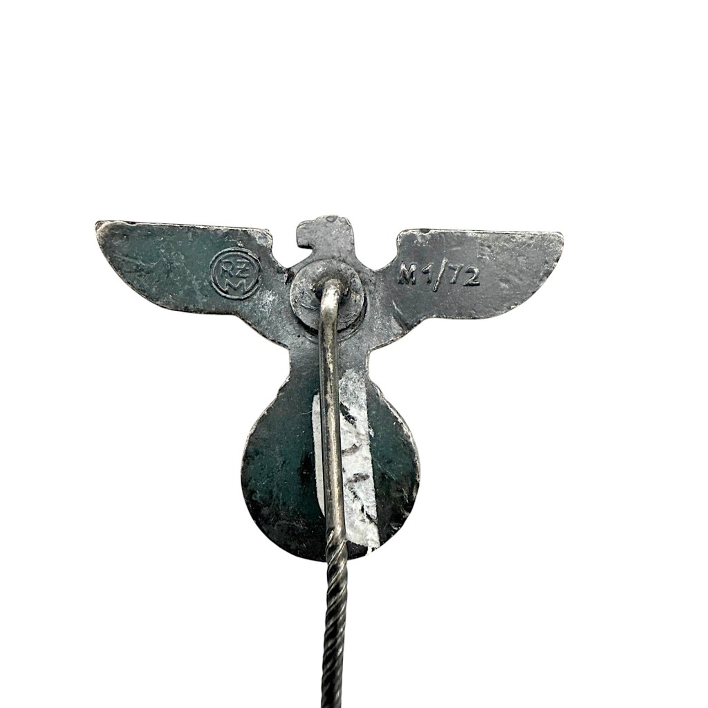 This NSDAP tie pin is an original German party insignia from the period of the Third Reich, issued by the National Socialist German Workers’ Party and produced by Fritz Zimmermann, marked RZM M1/72.