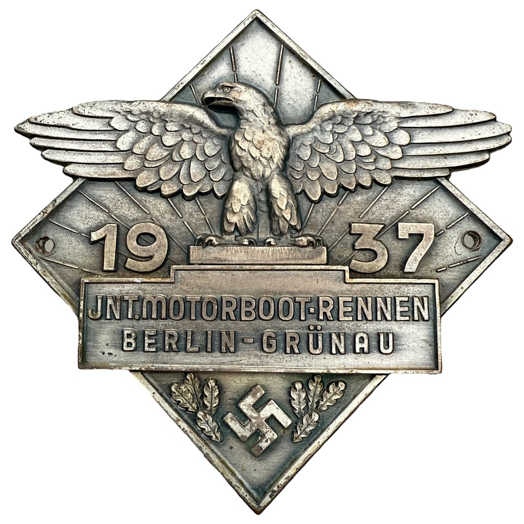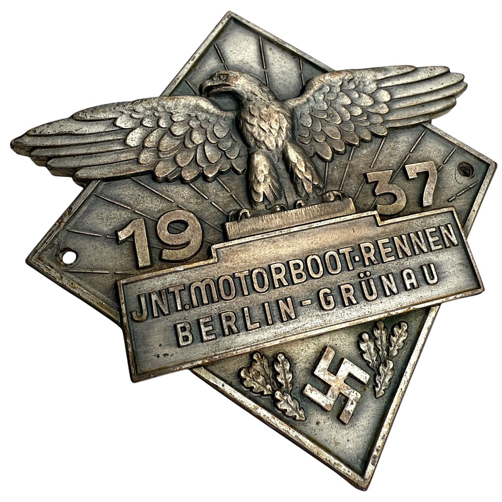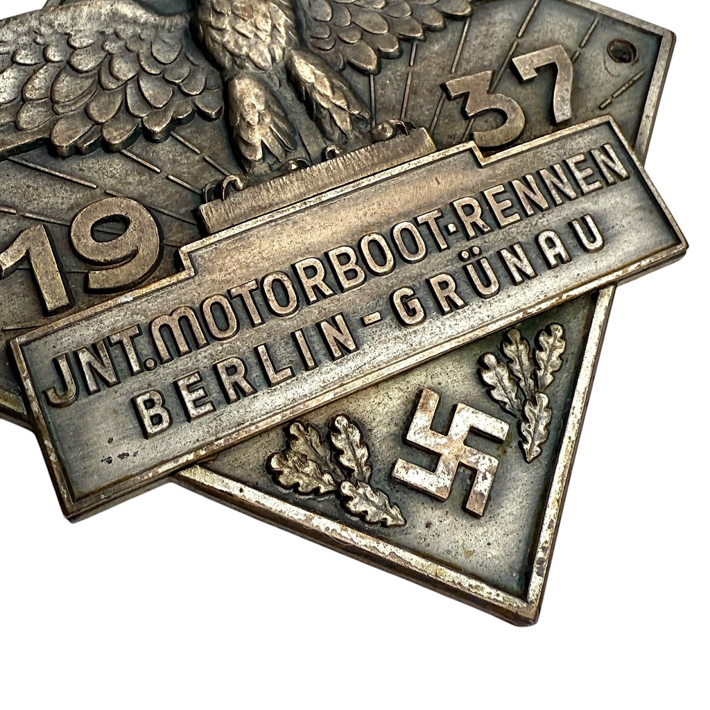 Deze Duitse metalen plaquette uit 1937 is een zeldzaam exemplaar dat werd uitgegeven ter gelegenheid van het Internationale Motorbootrennen in Berlin-Grünau, georganiseerd door het Nationalsozialistisches Kraftfahrkorps (NSKK).