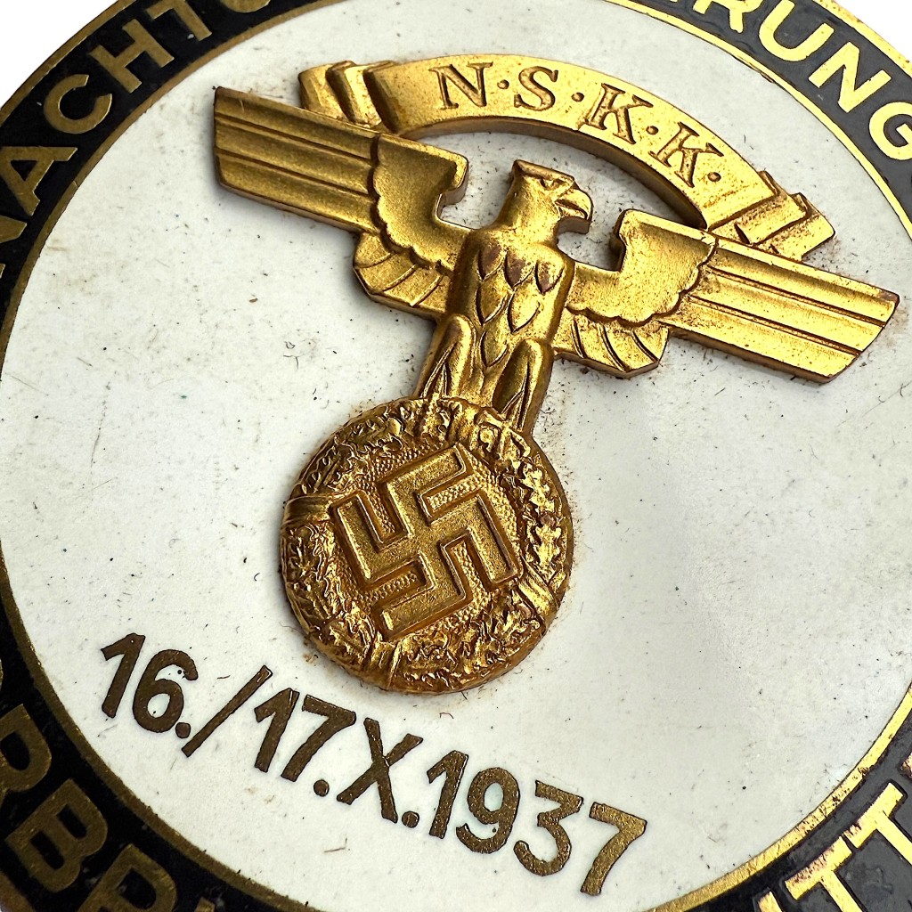 This detailed German plaque from 1937 was issued by the National Socialist Motor Corps (NSKK) to commemorate the Night Orientation Drive of the Motor Brigade Mitte on October 16–17, 1937.