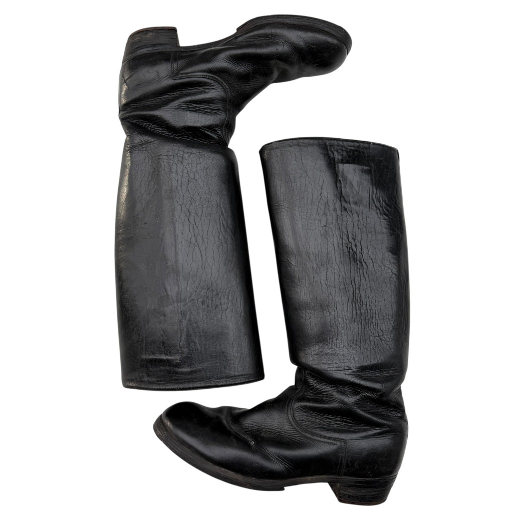 Deze Duitse officierslaarzen uit de Tweede Wereldoorlog zijn vervaardigd uit hoogwaardig zwart leer. De laarzen hebben een stevige leren zool met metalen hakbeslag. De schachten zijn hoog en strak gevormd, met aan de binnenzijde de oorspronkelijke leren voering en trekbandjes intact aanwezig.