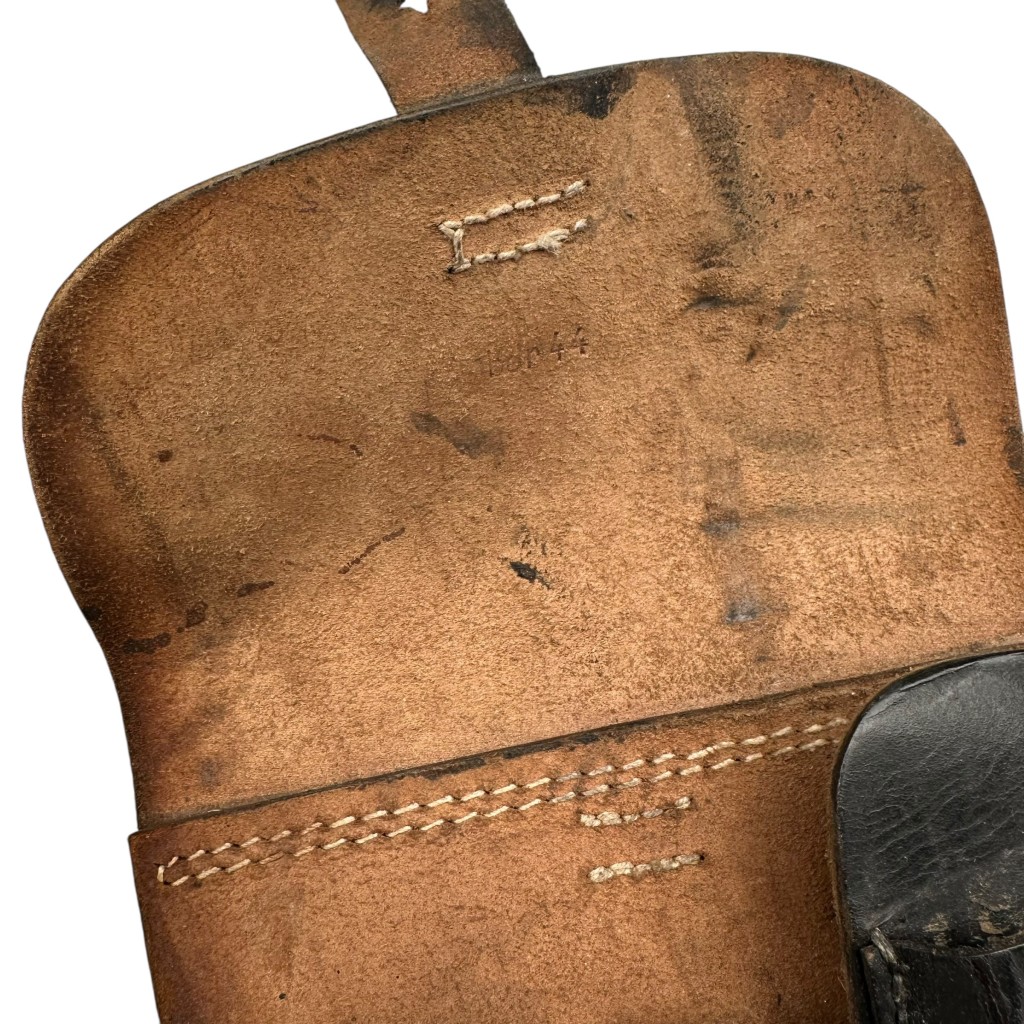 This original German P38 holster from 1944 is a late-war example made of black leather and clearly stamped “bdr 44”, the known maker code for Richard Ehrhardt, Lederwarenfabrik in Poessneck.