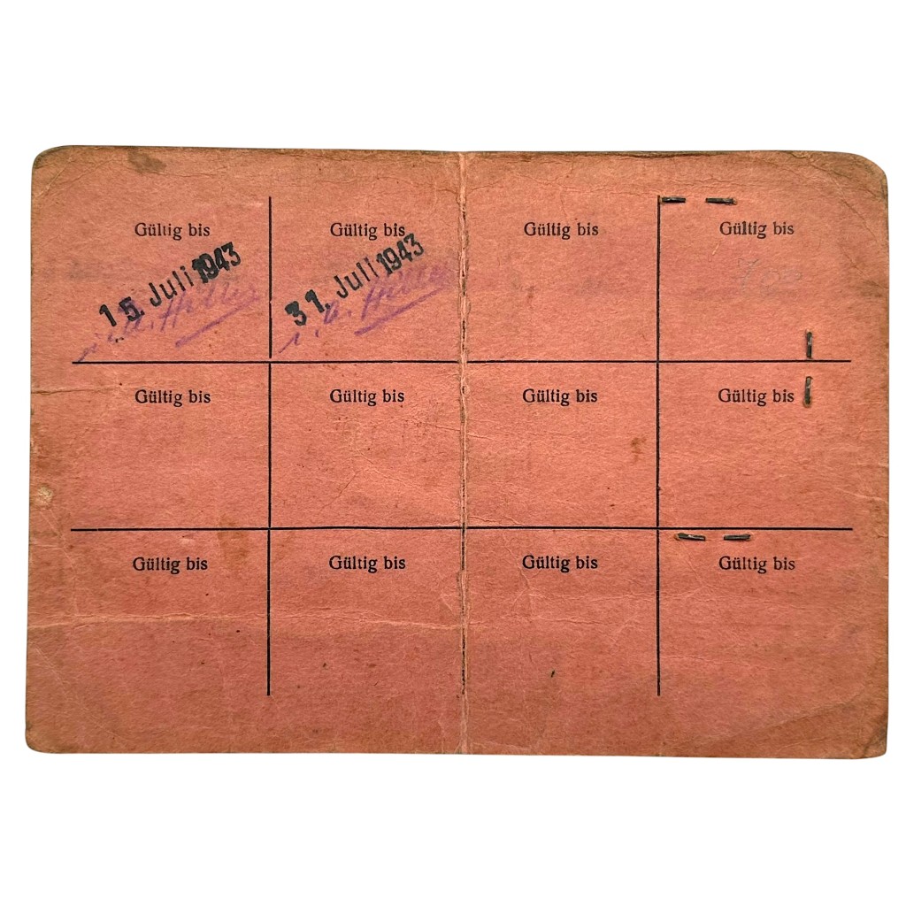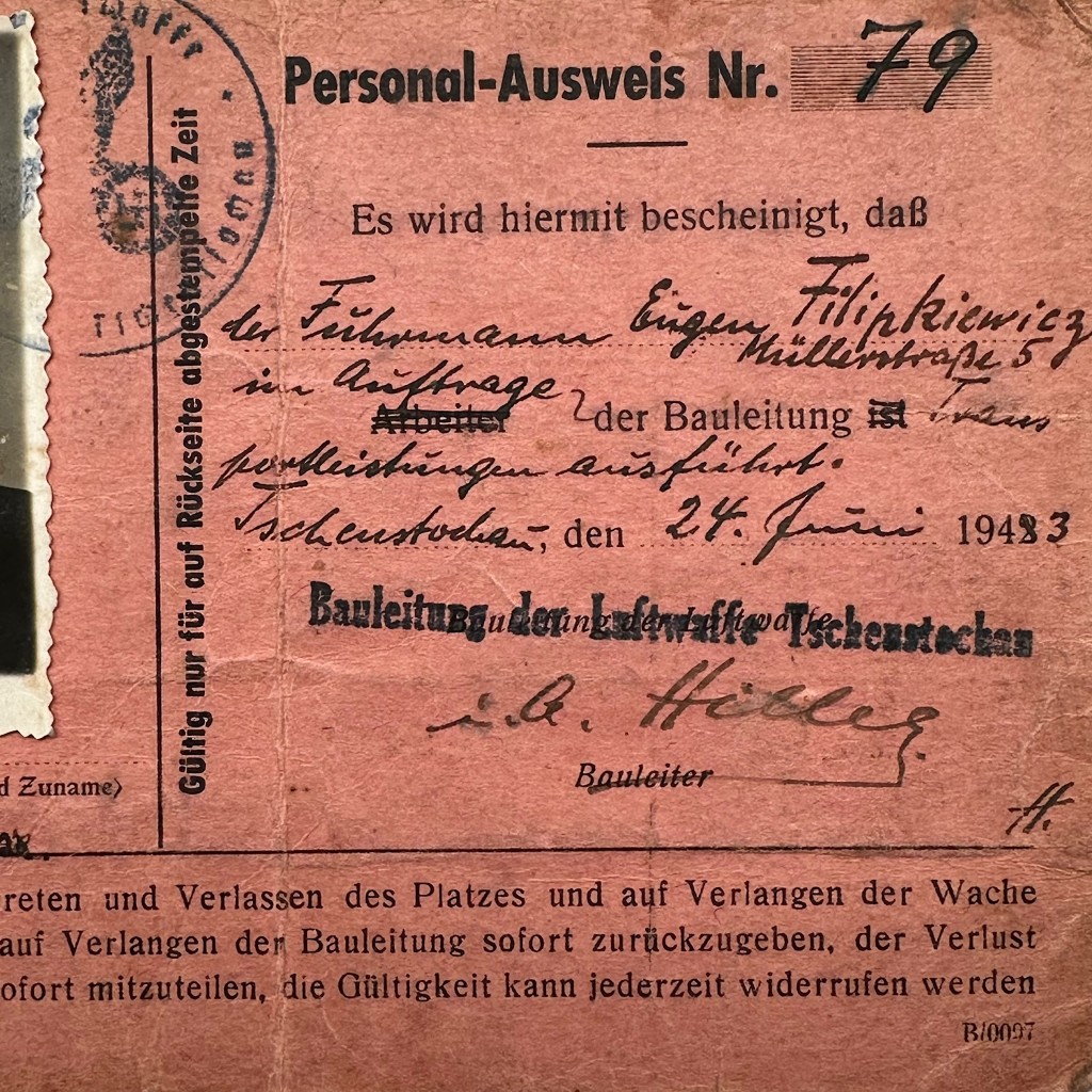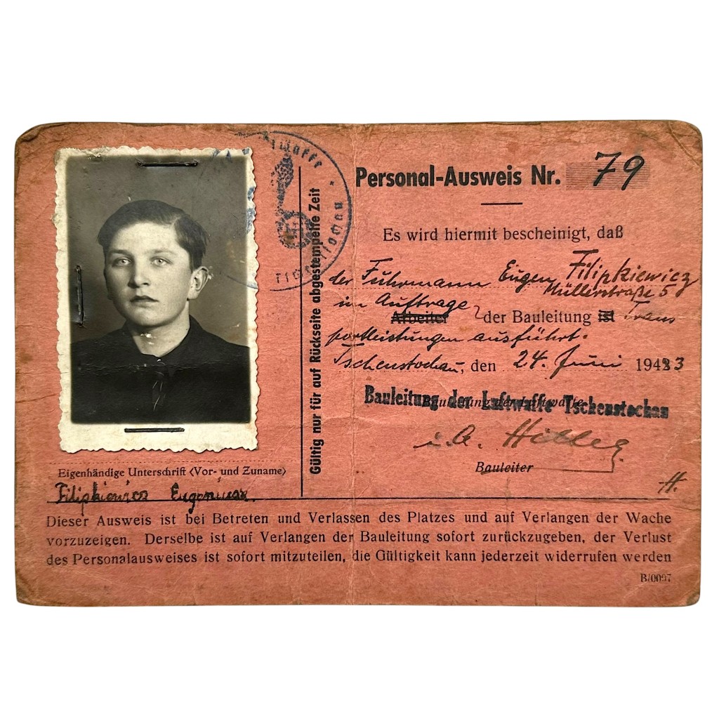 This original Personal-Ausweis No. 79 is a German occupation personnel identity card from 1943, issued in the name of Eugen Filipkiewicz, residing at Müllerstraße 53, and issued in Tschenstochau (Częstochowa) on June 27, 1943. The document served as identification for work carried out on behalf of the Luftwaffe Bauleitung (construction management) and includes an original passport photograph, the holder’s handwritten signature, and official stamps, including a round service stamp and validity extensions through July 1943. The condition is used and authentic, consistent with daily wartime use.