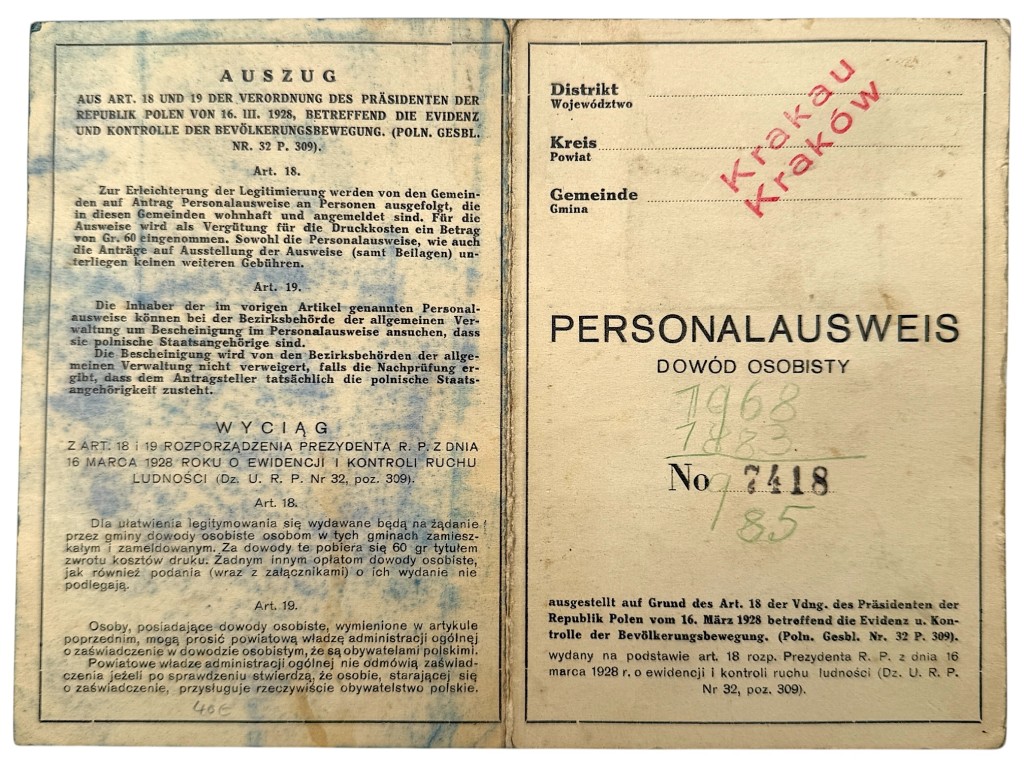 During the Second World War, Krakau served as the capital of the General Government under German occupation, where identity documents were essential for identification, registration, and control of the civilian population.