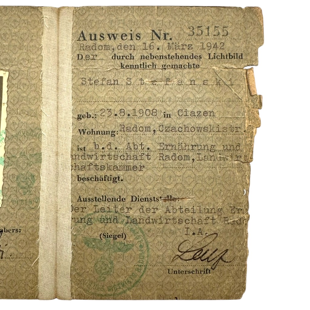 Deze originele Personalausweis für Nichtdeutsche Verwaltungsdienstangehörige (Ausweis Nr. 35155) betreft een Duits bezettingsdocument uit het Generalgouvernement, afgegeven te Radom op 16 maart 1942. De legitimatie staat op naam van Stefan Stępanski, geboren op 23 augustus 1908 te Ciazen, woonachtig te Radom, Czachowskistraße, en werkzaam bij de Abteilung Ernährung und Landwirtschaft Radom (Landwirtschaftskammer).