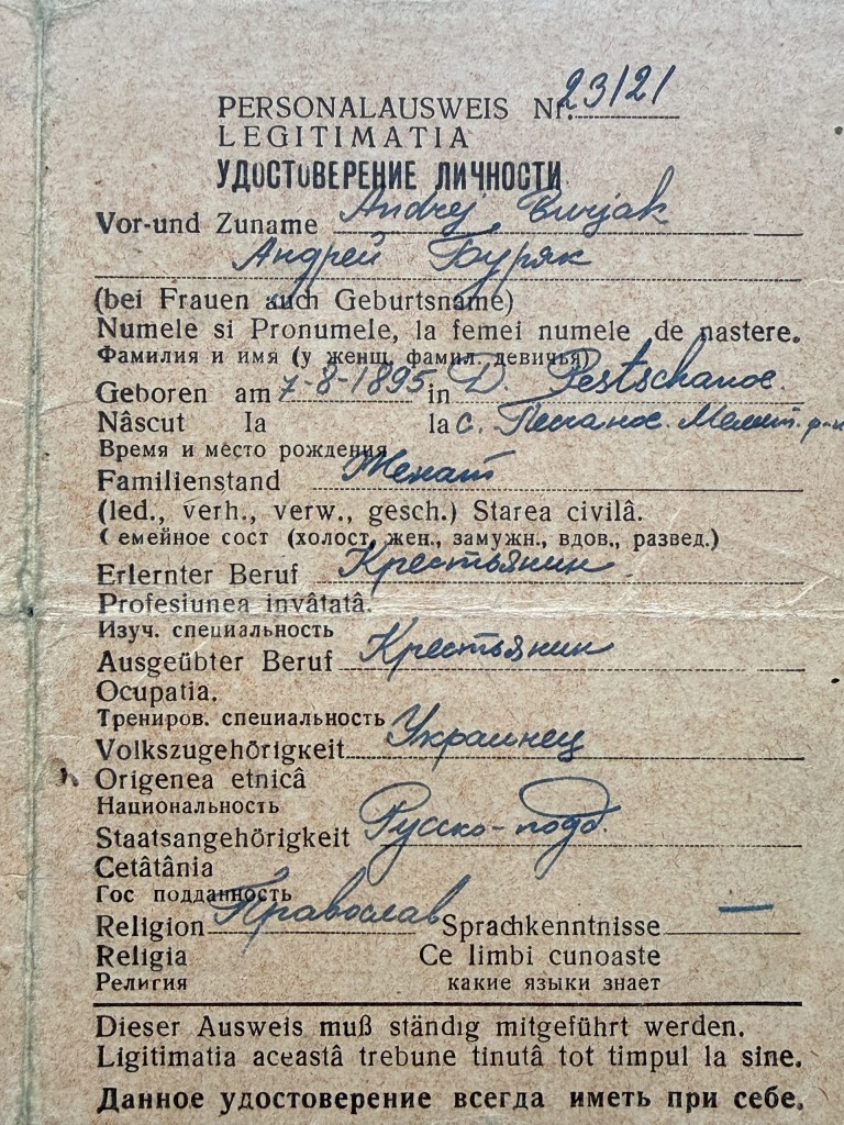 This original Personalausweis / Legitimatia (Udostoverenie Lichnosti) is a German occupation identity document from the Second World War, issued under number 23121 in the name of the Ukrainian man Andrej Burjak (born 7 August 1895 in Peschanoe, Ukraine).