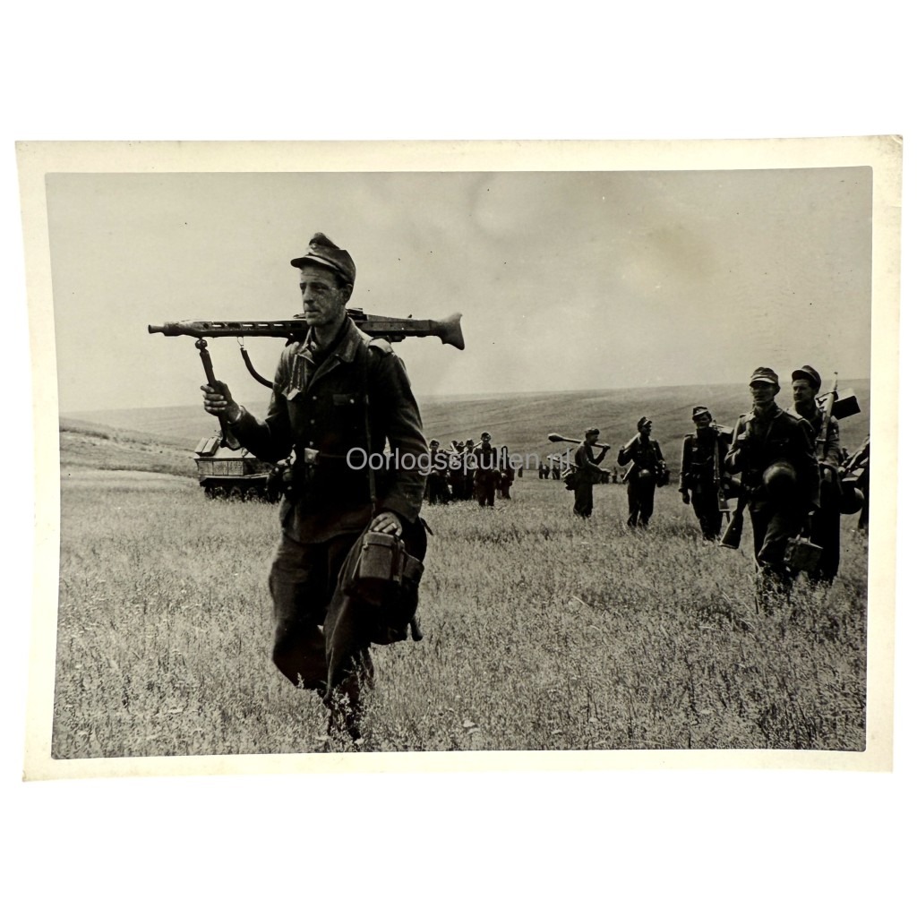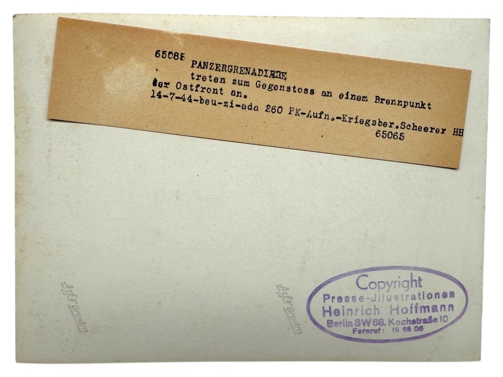 Gemaakt door Kriegsberichter Scheerer en uitgegeven door Heinrich Hoffmann, Hitlers huisfotograaf. Op de achterzijde bevindt zich het originele typelabel met beschrijving en de paarse copyrightstempel van Hoffmann.