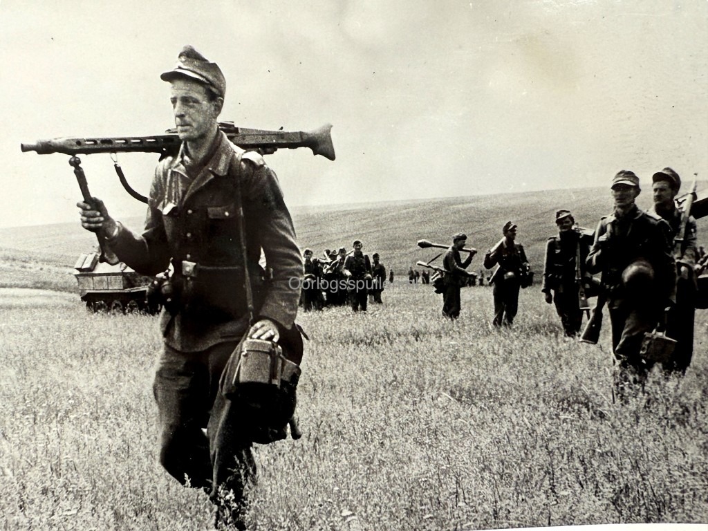 Opschrift achterzijde: „Panzergrenadiere treten zum Gegenstoss an einem Brennpunkt der Ostfront an. 14-7-44 … Kriegsberichter Scheerer“