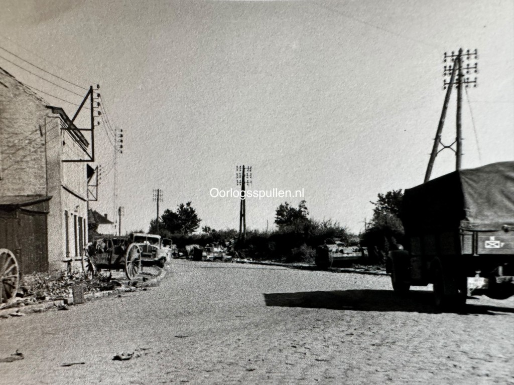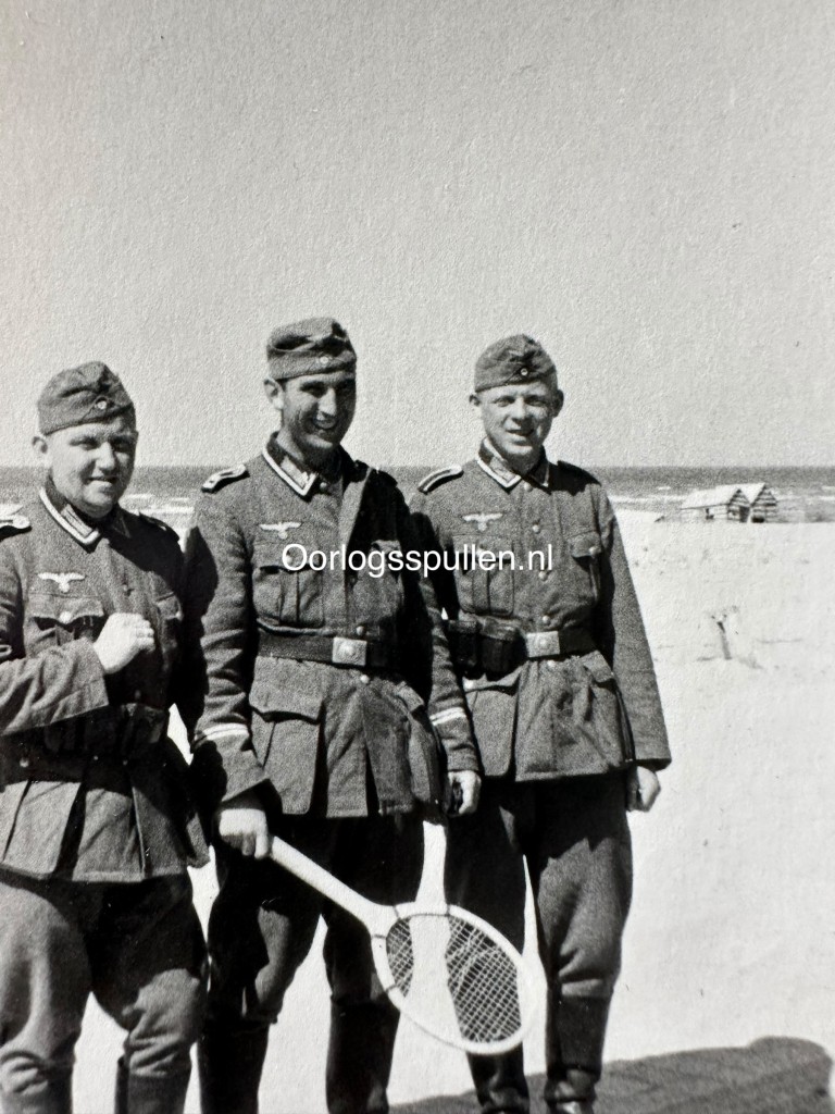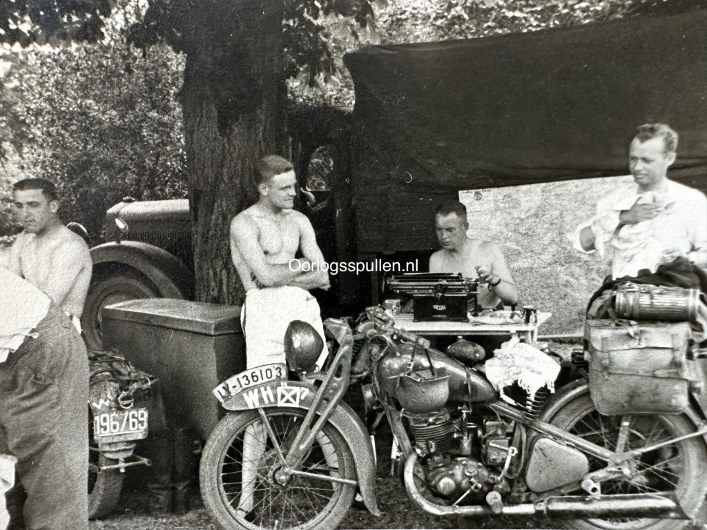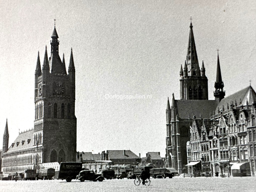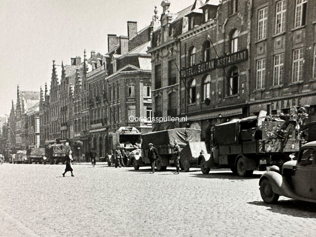 Originele set van 23 Duitse foto’s uit de beginfase van de Tweede Wereldoorlog, genomen tijdens de inval in België in 1940. De reeks geeft een indrukwekkend en samenhangend beeld van de opmars en het dagelijkse frontleven, met duidelijke opnamen uit Ieper (Ypres), waar herkenbare historische gebouwen en het stadsbeeld in oorlogstijd zichtbaar zijn. De foto’s tonen Duitse troepen en voertuigen in de stad, militaire colonnes op pleinen en straten en verschillende architectonische details van de zwaar historisch beladen omgeving. Daarnaast bevat de set aangrijpende kustscènes, waaronder een neergestort vliegtuig in het ondiepe water aan het strand en soldaten die het wrak onderzoeken. Ook is een veldgraf op het strand te zien, gemarkeerd met een bajonet en geïmproviseerd kruis. Samen vormen deze 23 originele foto’s een visueel verslag van de Duitse inval in België, met zowel stedelijke oorlogstaferelen als persoonlijke en menselijke momenten uit het soldatenleven. Een interessant verzamelobject voor verzamelaars van originele Tweede Wereldoorlog fotografie met betrekking tot België.