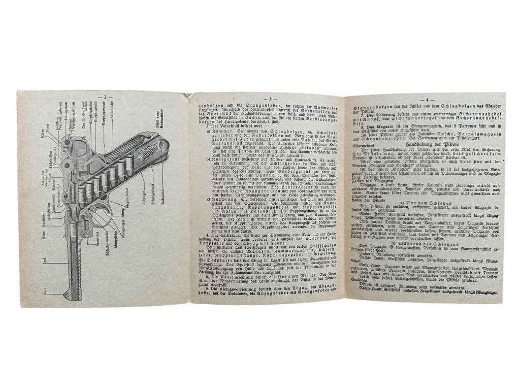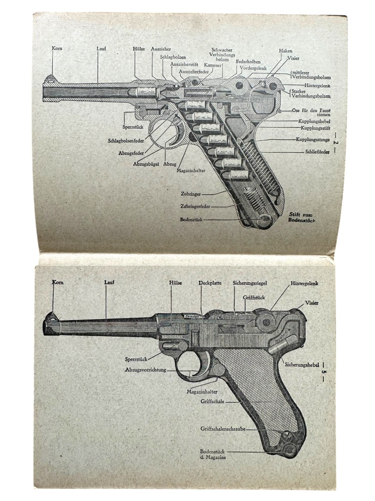 This original German instruction card for the Pistole 08 from 1941 provides a detailed overview of function and components.