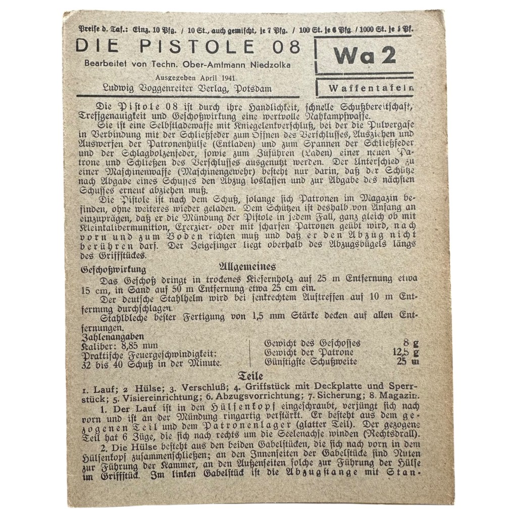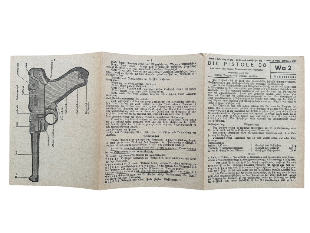 Deze originele Duitse handleiding kaart voor de Pistole 08 uit 1941 biedt een gedetailleerd overzicht van werking en onderdelen.