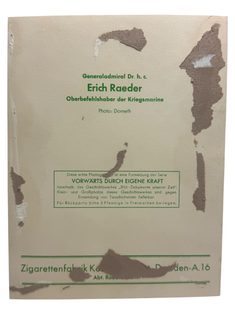 This original German portrait photograph from the Second World War depicts Oberbefehlshaber der Kriegsmarine Generaladmiral Erich Reader.