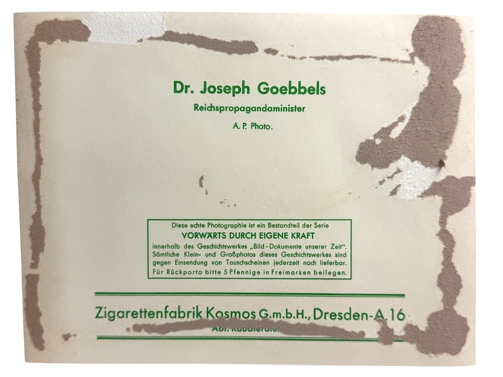 Deze originele Duitse portretfoto uit de Tweede Wereldoorlog toont Joseph Goebbels, Rijksminister van Propaganda. De foto maakt deel uit van de fotoserie ‘Vorwärts durch eigene Kraft’, uitgegeven door de Kosmos Zigarettenfabrik G.m.b.H. in Dresden.