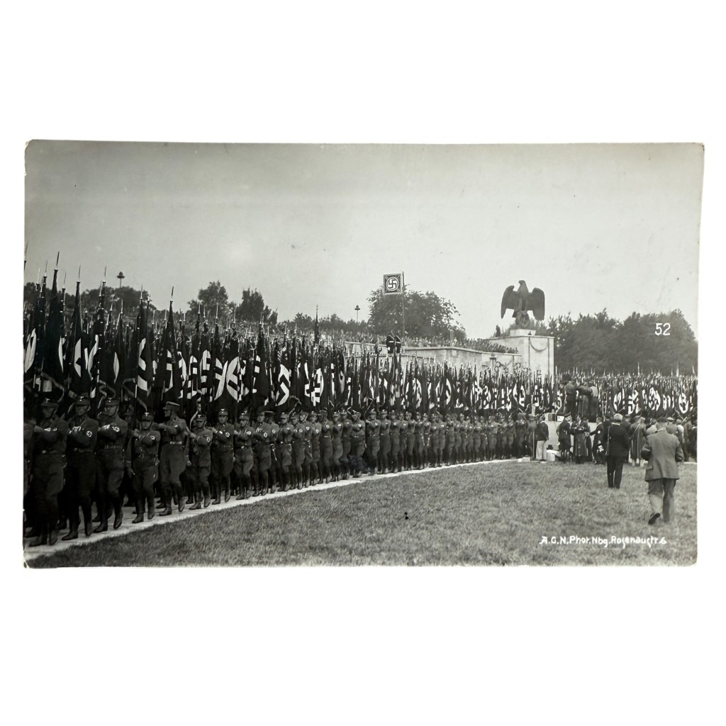 This German postcard is in good condition and depicts SA members with flags during an event.