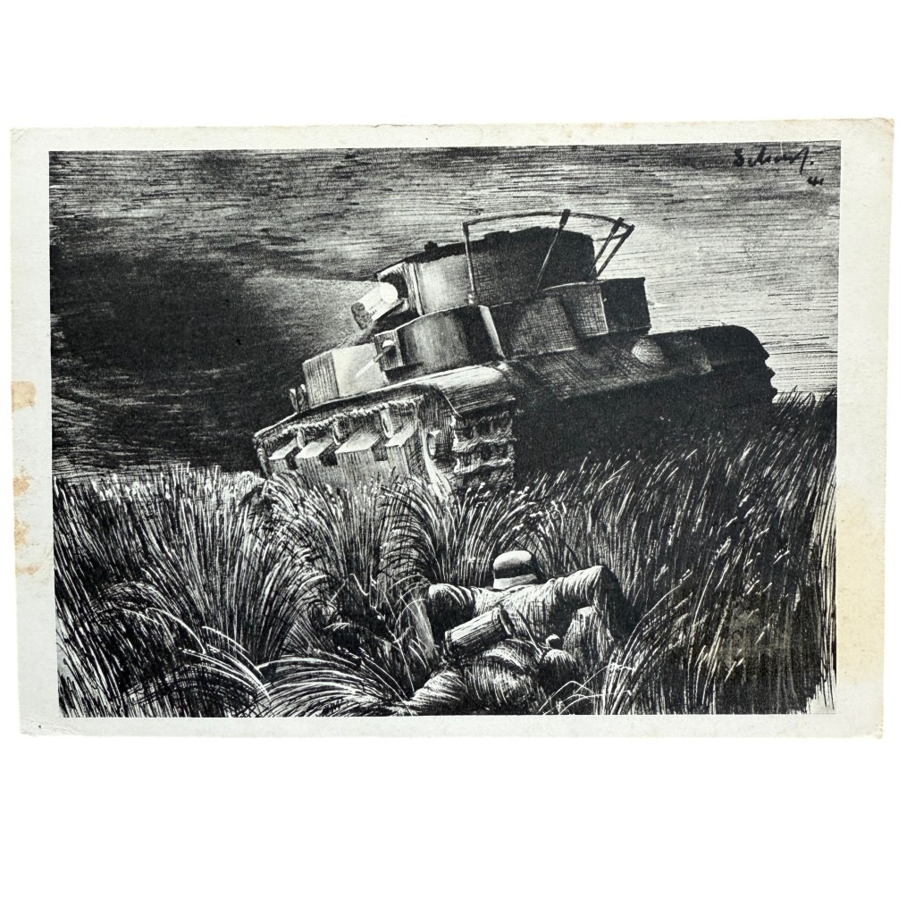 This German postcard is in good condition and depicts a drawing of a German soldier with tank.