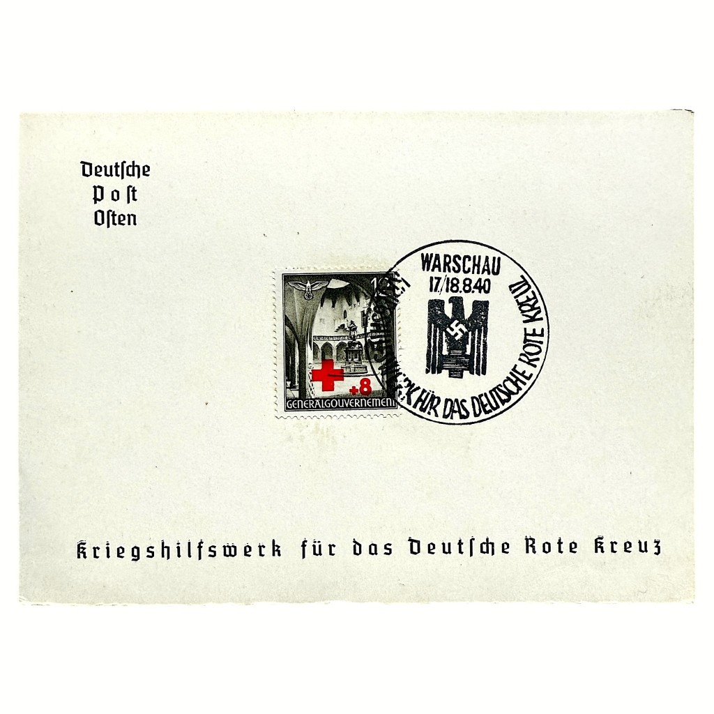 This postcard from 1940, issued by the Deutsche Post Osten, features a clear postmark from Warsaw (17/18.8.40) created for a fundraising campaign for the Deutsches Rotes Kreuz. The card bears a detailed DRK charity stamp from the General Government, with a striking contrasting red overprint.