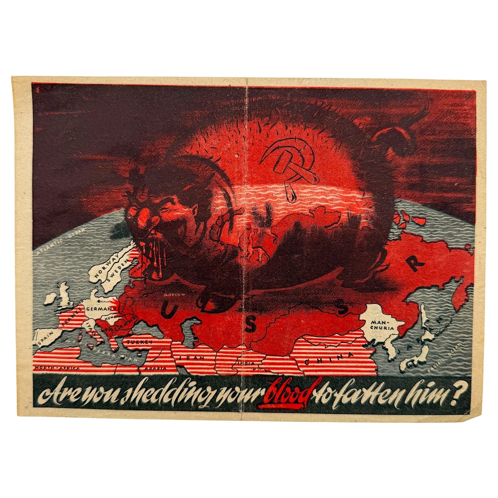 De voorzijde toont een fel anti-Sovjet-illustratie van een grotesk afgebeeld communistisch monster boven de kaart van Europa, voorzien van het opvallende opschrift: “Are you shedding your blood to fatten him?” bedoeld om geallieerde militairen te ontmoedigen en verdeeldheid te zaaien.
