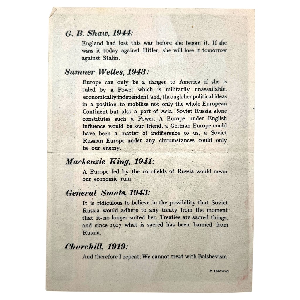 The reverse side contains a selection of quotations from Western politicians and public figures, presented to cast doubt on the cooperation with the Soviet Union.