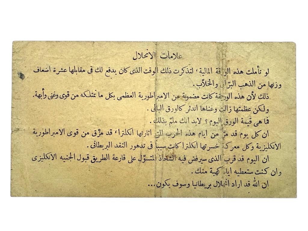 The reverse, however, is printed with Arabic text spreading anti-British propaganda.