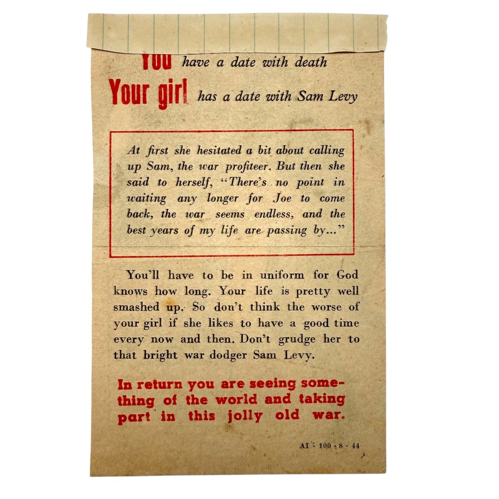 In the leaflet, an American soldier is confronted with the suggestion that his girlfriend back home is going out with “Sam Levy,” a deliberately chosen Jewish name that plays into Nazi stereotypes portraying Jews as war profiteers and draft dodgers.