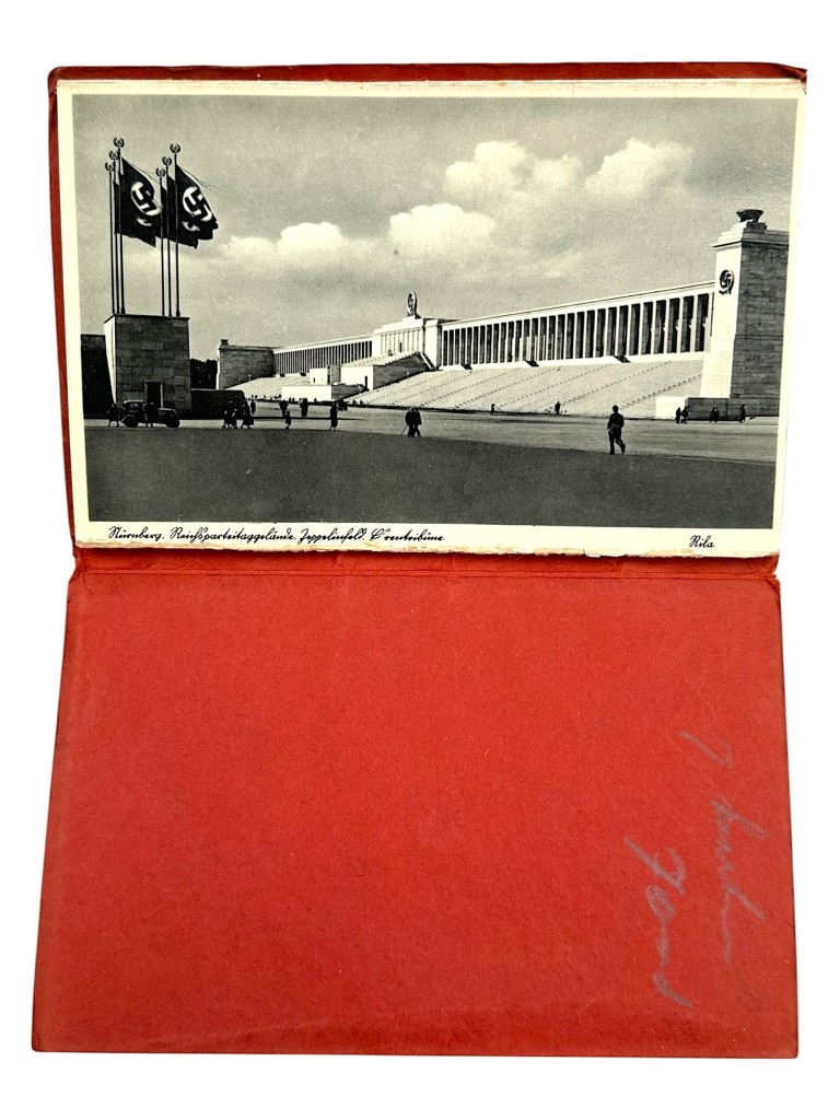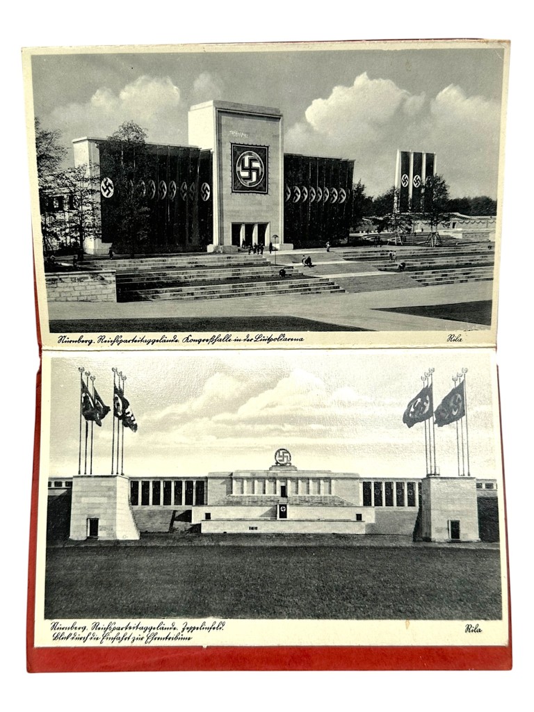 Dit zeldzame propagandistische souvenir toont verschillende monumentale gebouwen en paradeplaatsen van het complex, waaronder de Luitpoldarena, Zeppelinfeld en erehallen, vastgelegd in periodestijl fotografie.