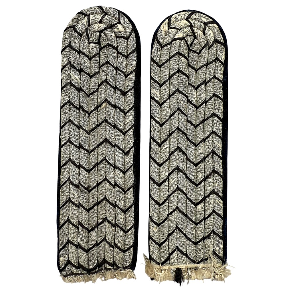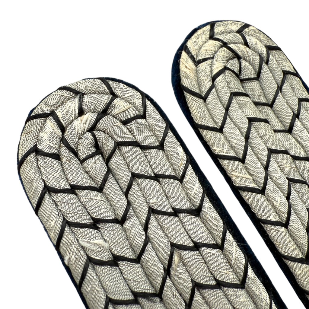 The shoulder boards are made of silver-colored braided cord with black interwoven edges and are mounted on a dark base.