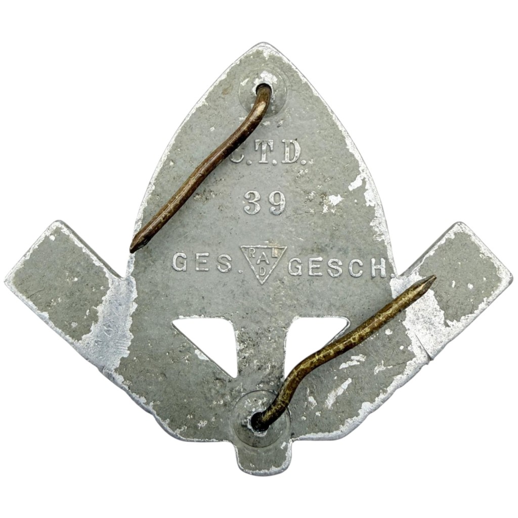 The reverse is correctly marked with R.A.D., the year 39, and Ges. Gesch., and is fitted with the original attachment prongs for mounting on a cap.