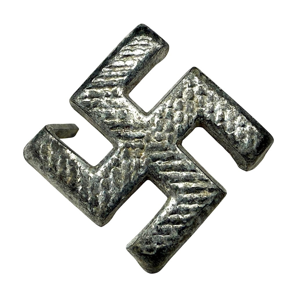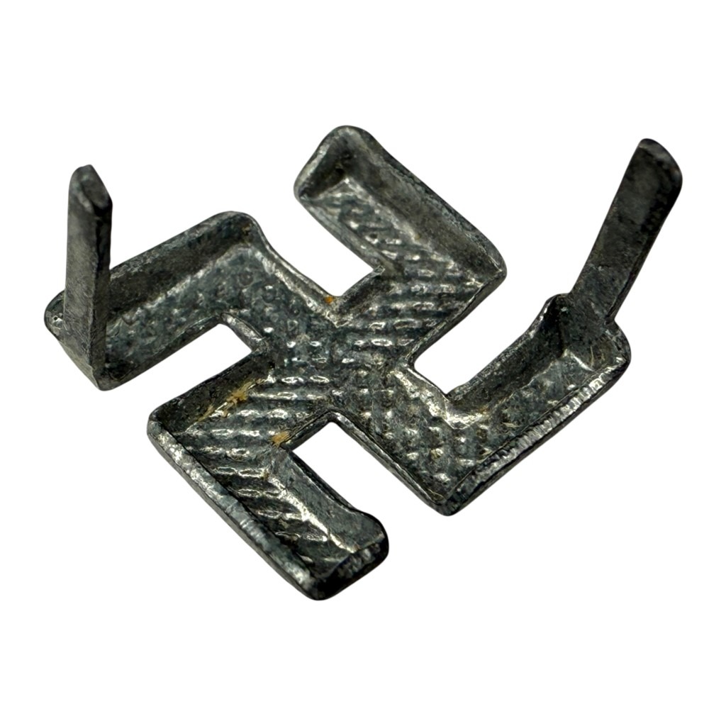 This German Reichsbahn metal swastika insignia is in good condition and was worn on the DRB (Deutsche Reichsbahn) collar tabs during World War II.