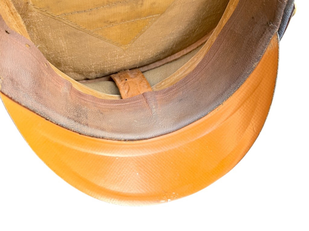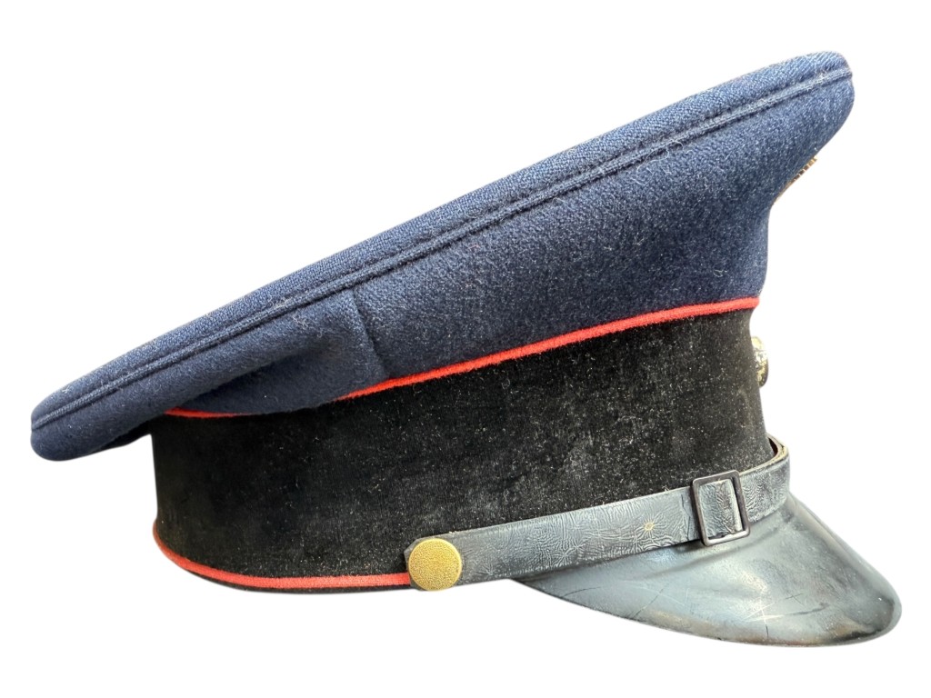 The leather chin strap is fastened with metal buttons and the visor is made of black patent leather.
