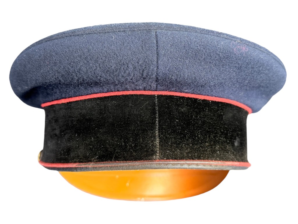 The cap is made of dark blue wool with a black velvet band and red piping, typical of Reichsbahn railway personnel.