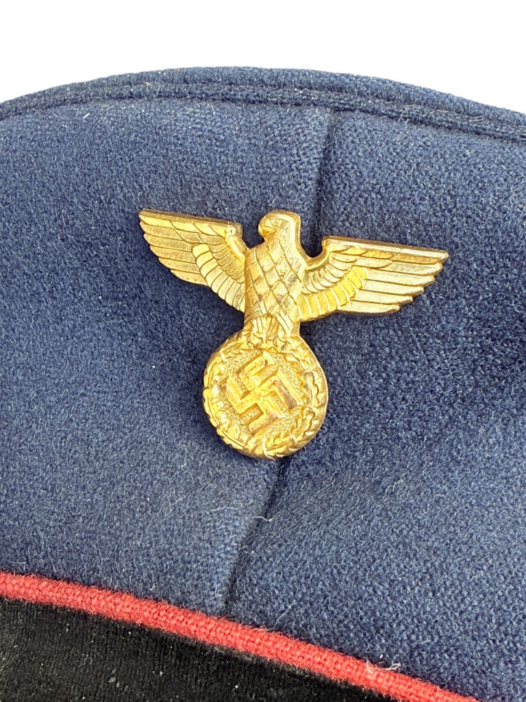 De pet is uitgevoerd in donkerblauwe wol met een zwarte fluwelen band en rode bies, typerend voor het spoorwegpersoneel van de Reichsbahn.