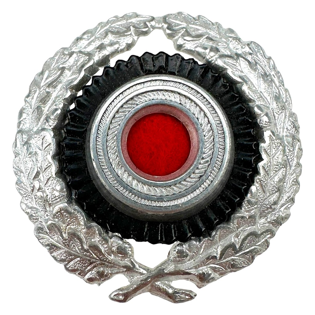 Original German Reichspost cockade intended for attachment to a Schirmmütze (visor cap). This example features the characteristic silver-colored oak leaf wreath with the black-red cockade in the center.