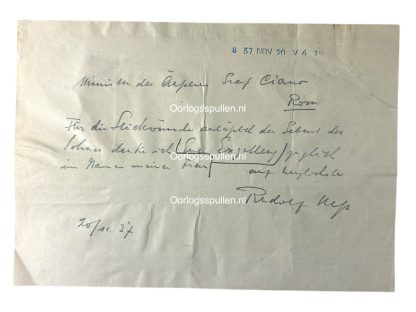 De telegram van Galeazzo Ciano heeft Hess zelf vertaald aan de achterzijde en met potlood beschreven.