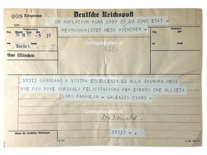 - Telegram from Italian fascist statesman and former Ambassador of Italy to the Vatican, Galeazzo Ciano, dated November 20, 1937, congratulating Rudolf Hess on the birth of his child.
