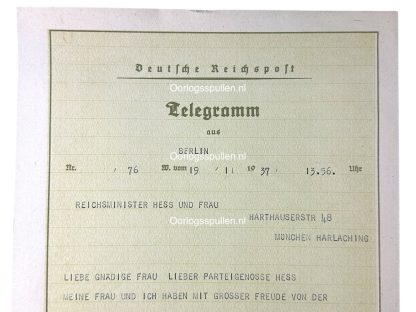 - Telegram van de ouders van Rudolf Hess, verstuurd vanuit Alexandrië (Egypte) op 18 november 1937, met felicitaties voor de geboorte van hun kleinzoon.