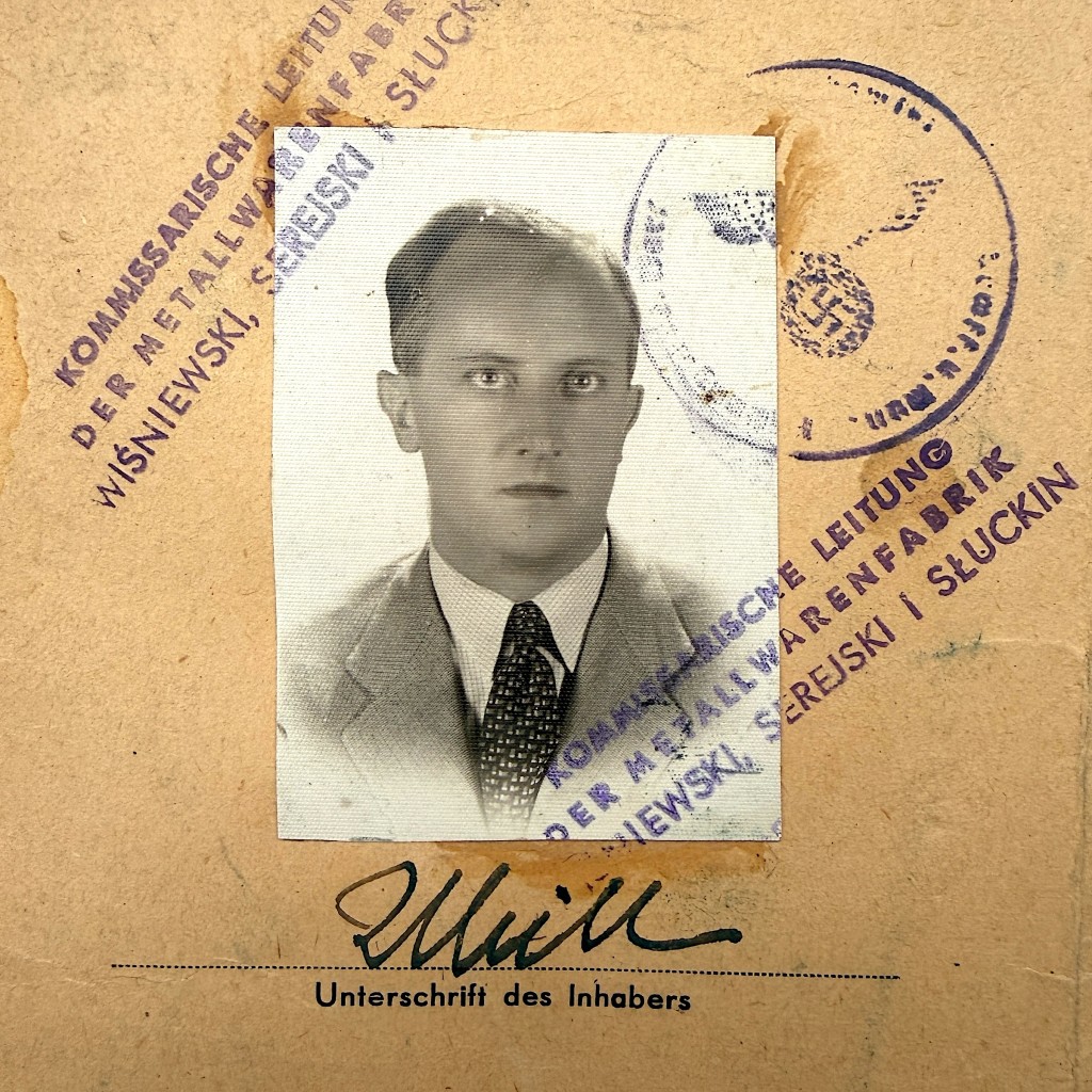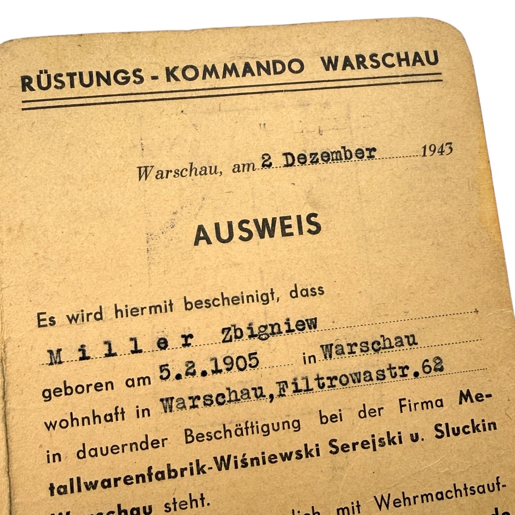 Deze originele zeldzame Ausweis betreft een Duitse bedrijfs- en legitimatiepas uit 1943, uitgegeven door het Rüstungs-Kommando Warschau (des Reichsministers für die Bewaffnung und Munition). Het document staat op naam van Zbigniew Miller, geboren op 5 februari 1905 in Warschau, woonachtig aan Filtrowastr. 62, Warschau, en bevestigt zijn vaste dienstverband bij de firma Metallwarenfabrik Wiśniewski, Serejski u. Sluckin te Warschau. De pas werd afgegeven op 2 december 1943 en vermeldt dat het bedrijf uitsluitend Wehrmachtsopdrachten uitvoerde en onder toezicht stond van het Rüstungs-Kommando; het document is voorzien van pasfoto, handtekening van de houder, officiële stempels en meerdere verlengingen in 1944. De Ausweis verkeert in gebruikte conditie passend bij intensief gebruik in oorlogstijd. Tijdens de Tweede Wereldoorlog stond Warschau onder Duits bezettingsbestuur binnen het Generalgouvernement en speelde de stad een belangrijke rol in de oorlogsindustrie, waar fabrieken onder toezicht van het Rüstungs-Kommando produceerden voor de Wehrmacht.