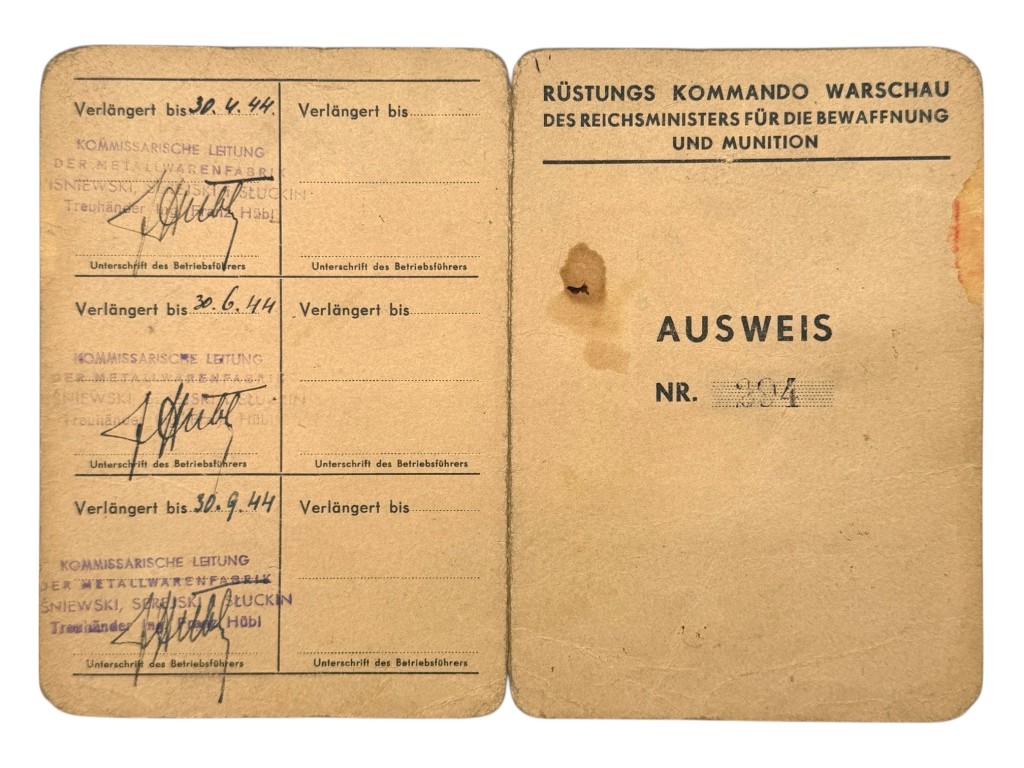 This original rare Ausweis is a German company and identification pass from 1943, issued by the Rüstungs-Kommando Warschau (of the Reich Ministry for Armaments and Munitions).