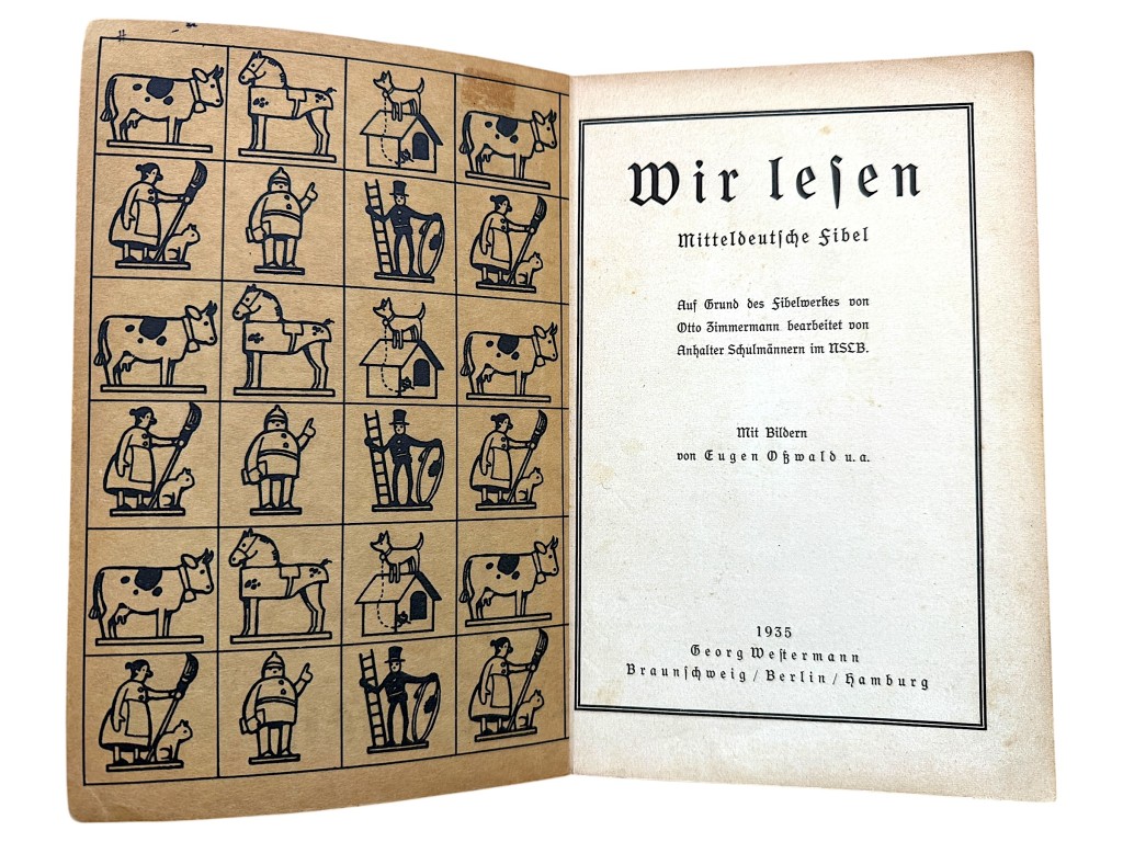 Deze Duitse schooluitgave, getiteld “Mitteldeutsche Fibel – Wir lesen”, werd gedrukt in 1935 in Dessau door Georg Westermann Verlag (Braunschweig / Berlin / Hamburg).