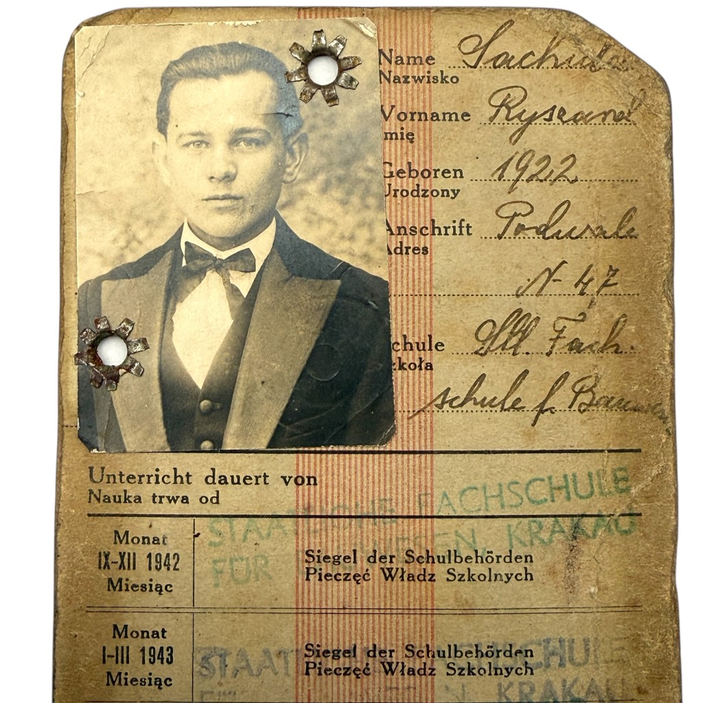 Het document staat op naam van Ryszard Sachulz, geboren in 1922, met adres Podgórze N° 47, en vermeldt zijn inschrijving aan de Staatliche Fachschule für Bau in Krakau.
