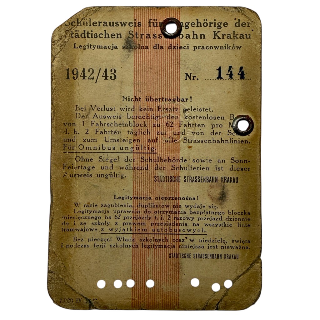 De kaart gaf recht op gratis tramvervoer (62 ritten per maand) via de Städtische Strassenbahn Krakau en is voorzien van pasfoto, schoolstempels en officiële vermeldingen. Het document verkeert in gebruikte conditie passend bij intensief gebruik in oorlogstijd.