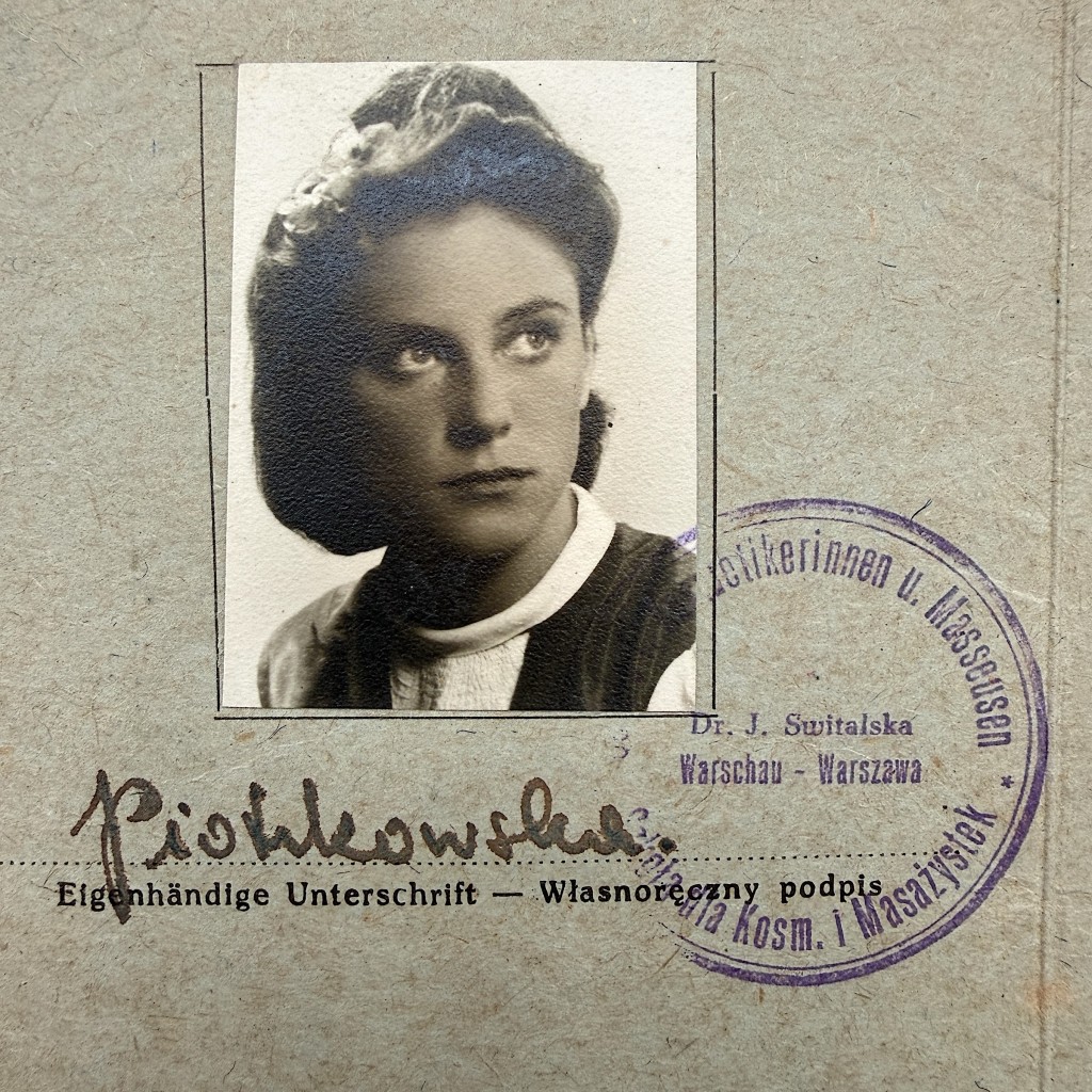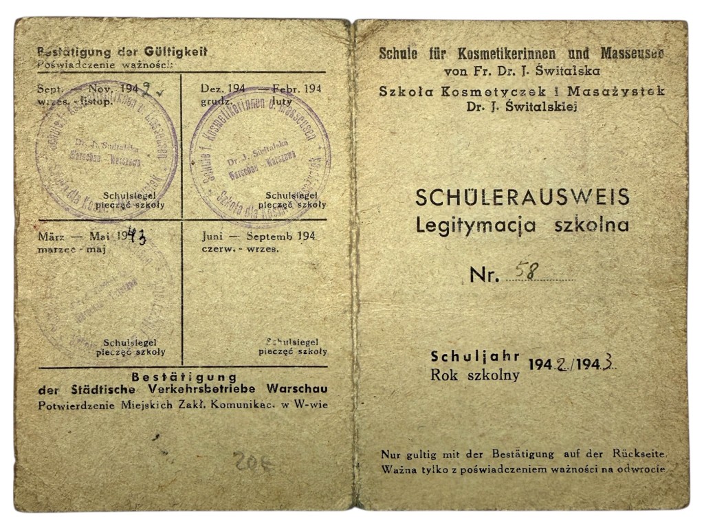 Deze originele Schülerausweis (Legitymacja szkolna) Nr. 58 betreft een Duitse schoollegitimatie uit het schooljaar 1942/1943, uitgegeven in Warschau voor een leerlinge van de Schule für Kosmetikerinnen und Masseurinnen von Fr. Dr. J. Świtalska, gevestigd aan Neue-Burgstr. 20 W. 3 (Pools: ul. Nowogrodzka 20 m. 3) te Warschau. Het document staat op naam van Jadwiga Piotrowska, geboren op 17 april 1919 te Warschau, woonachtig aan ul. Żurawia 26, en is voorzien van pasfoto, eigenhandige handtekening, meerdere schoolstempels en geldigheidsbevestigingen op de achterzijde; tevens draagt het stempels van de Distriktsgesundheitskammer Warschau, ul. Żelazna 37 (Fachgruppe: Feldschere). De legitimatie verkeert in gebruikte conditie, passend bij oorlogstijd. Tijdens de Tweede Wereldoorlog stond Warschau onder Duits bezettingsbestuur binnen het Generalgouvernement, waar onderwijsinstellingen en beroepsopleidingen onder toezicht van de bezettingsautoriteiten functioneerden.