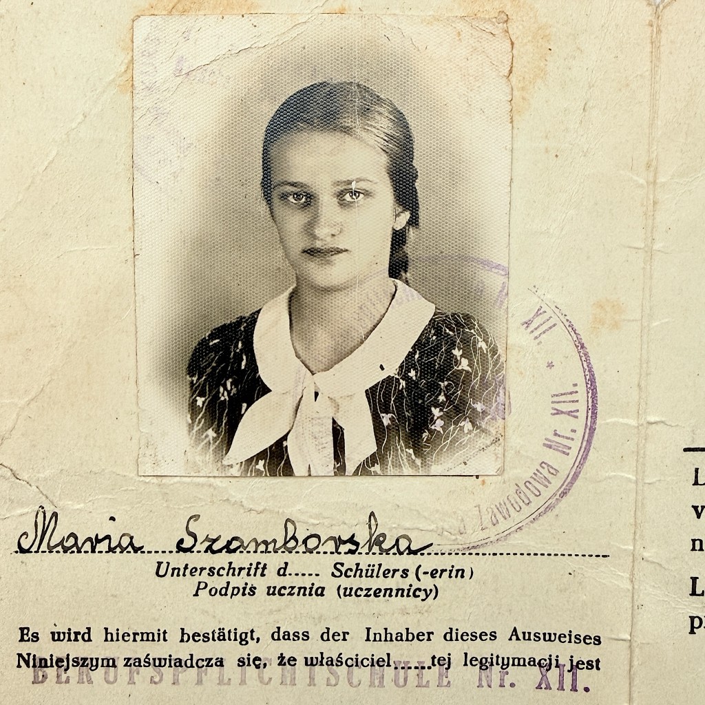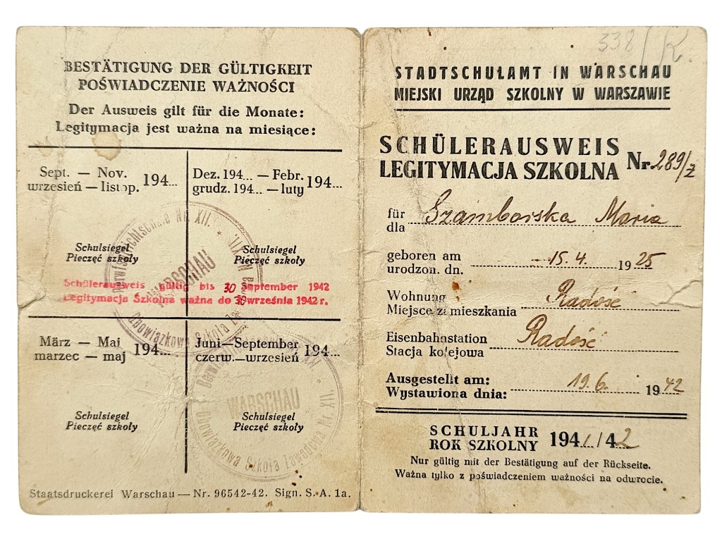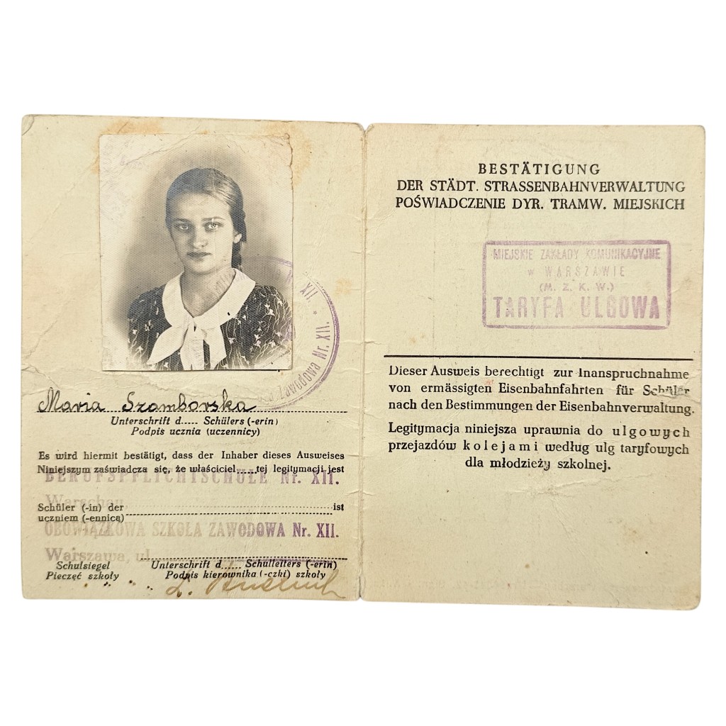 Het document staat op naam van Maria Szamborska, geboren op 15 april 1925, woonachtig te Radość, met vermelding van het plaatselijke spoorwegstation Radość; de legitimatie werd afgegeven op 19 juni 1942 en diende als officieel schoolbewijs en als recht op gereduceerd vervoer volgens de geldende tariefregeling. De pas is voorzien van pasfoto, handtekening van de leerlinge, stempels van de schoolautoriteiten en geldigheidsbevestigingen op de achterzijde. Het document verkeert in duidelijk gebruikte conditie, passend bij intensief gebruik in oorlogstijd.
