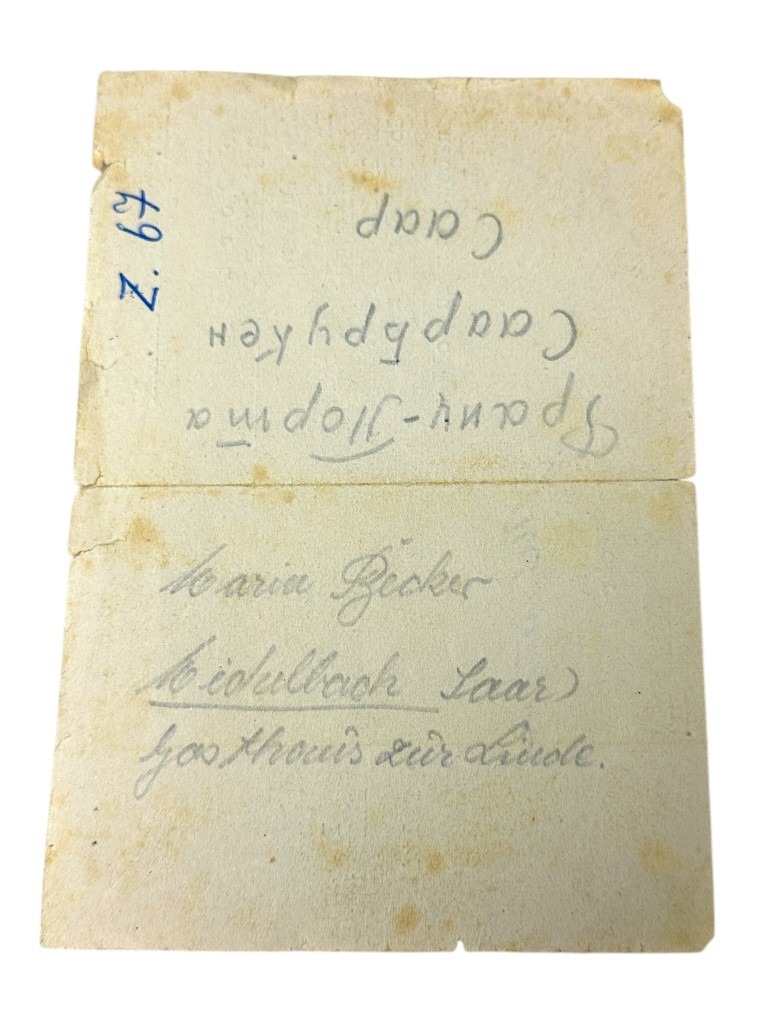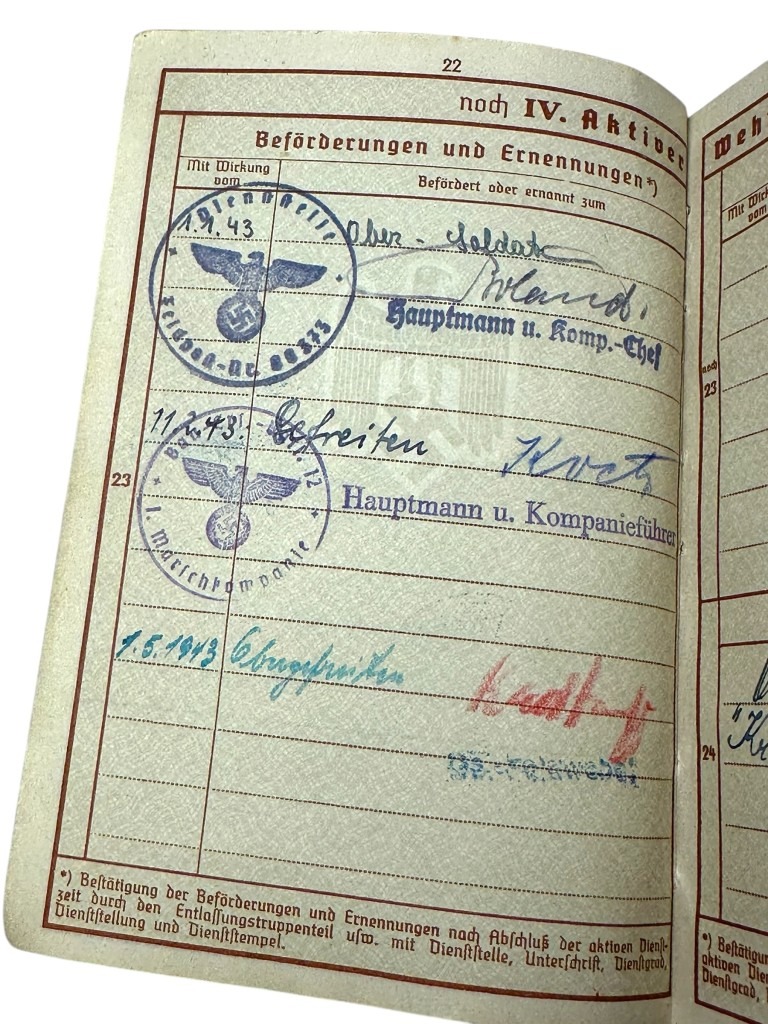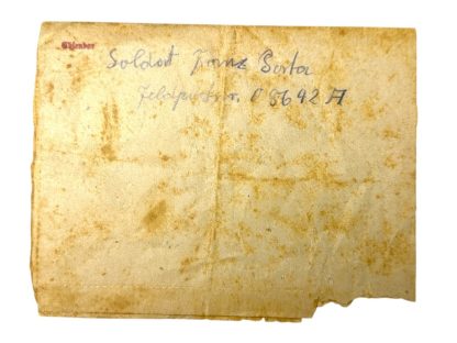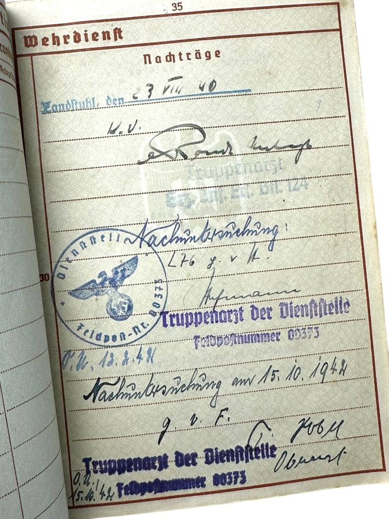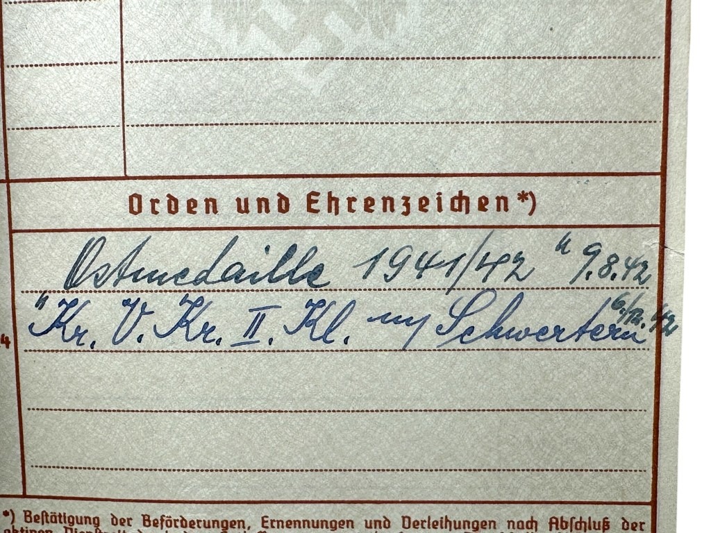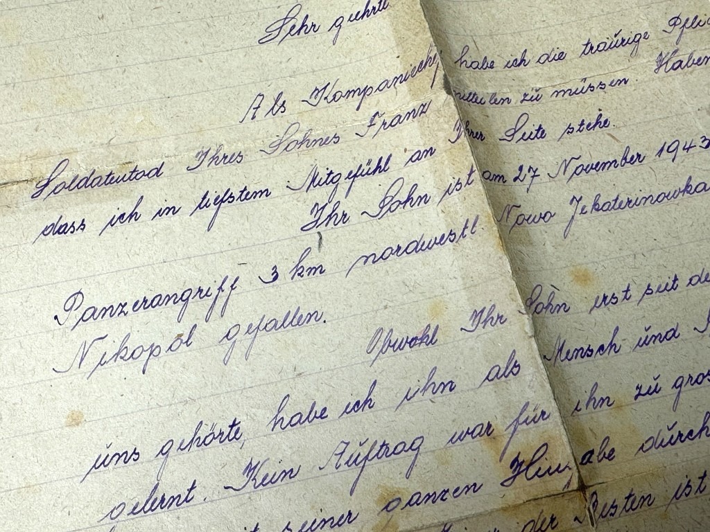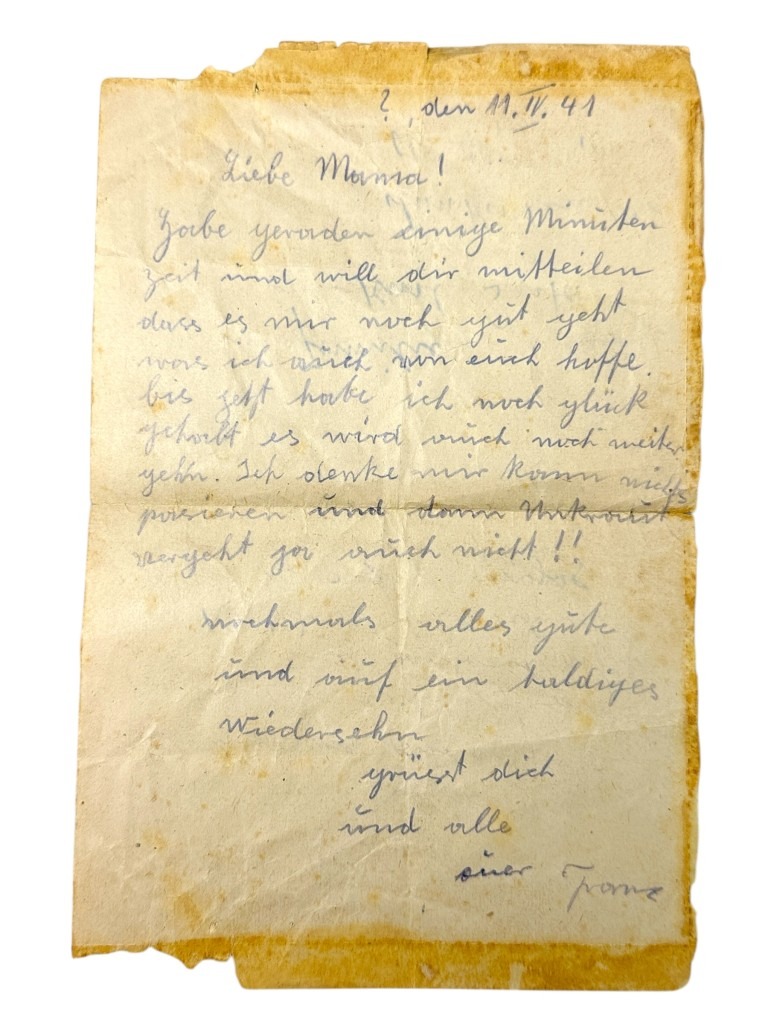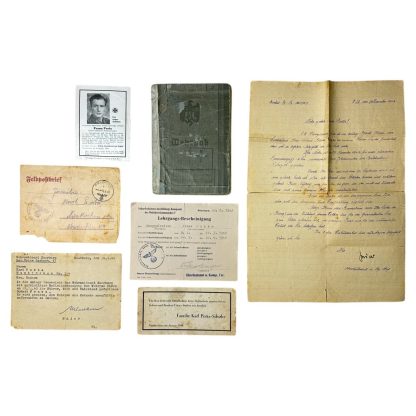 In deze set zit zijn Wehrpass, militaire bidprentje, Scharfschutze opleiding document, handgeschreven veldpostbrief van Franz, handgeschreven brief van zijn Oberleutnant die verteld over hoe hij gesneuveld is (Tijdens een Russische tankaanval), condoleance kaartje aan de familie, document mbt deze Wehrpass uit 1944.