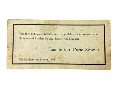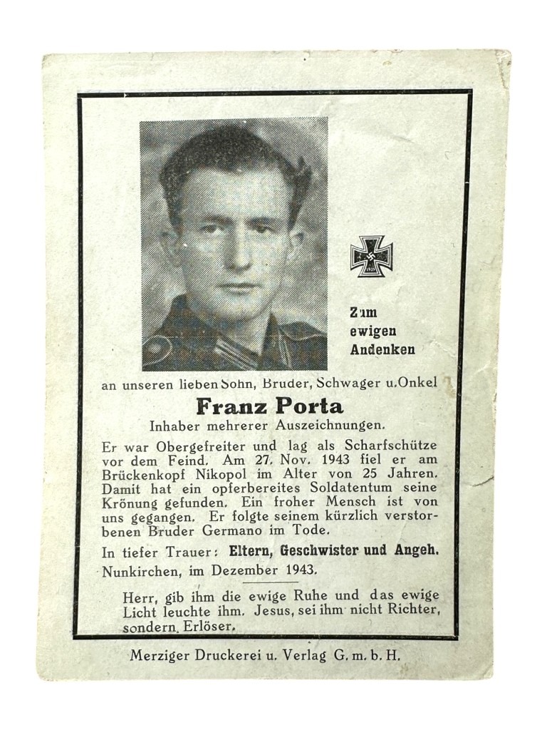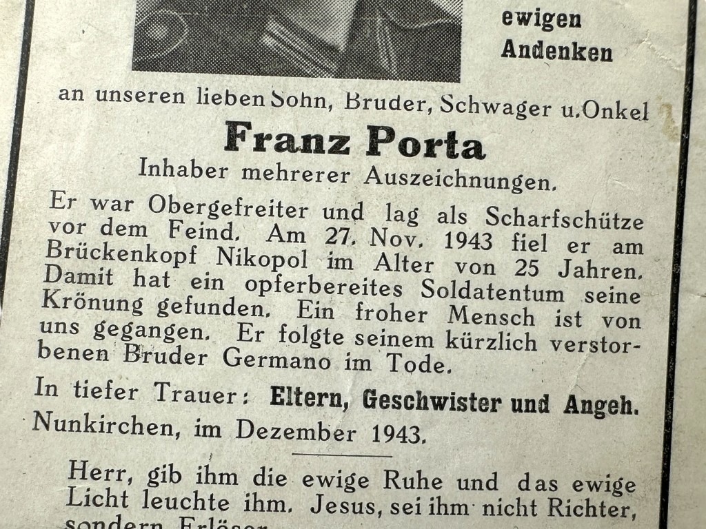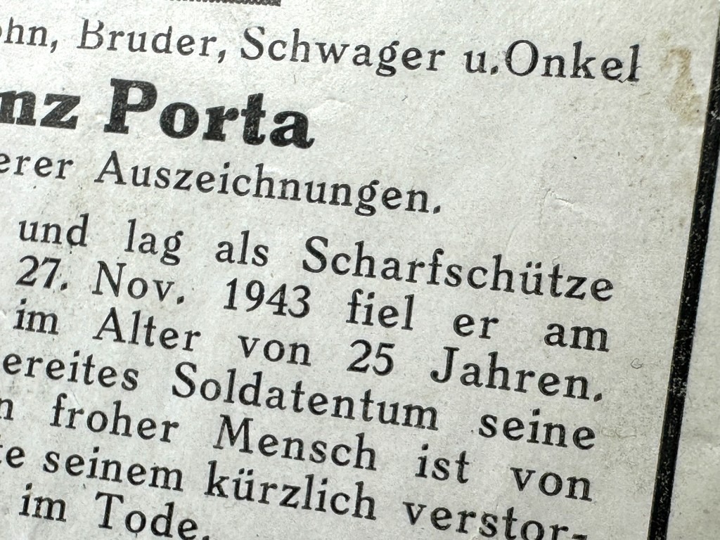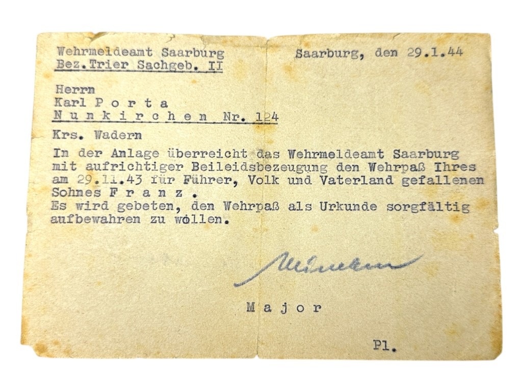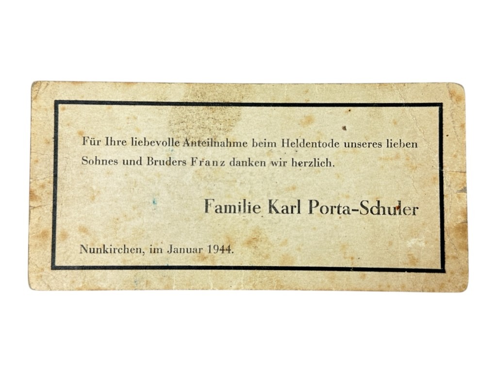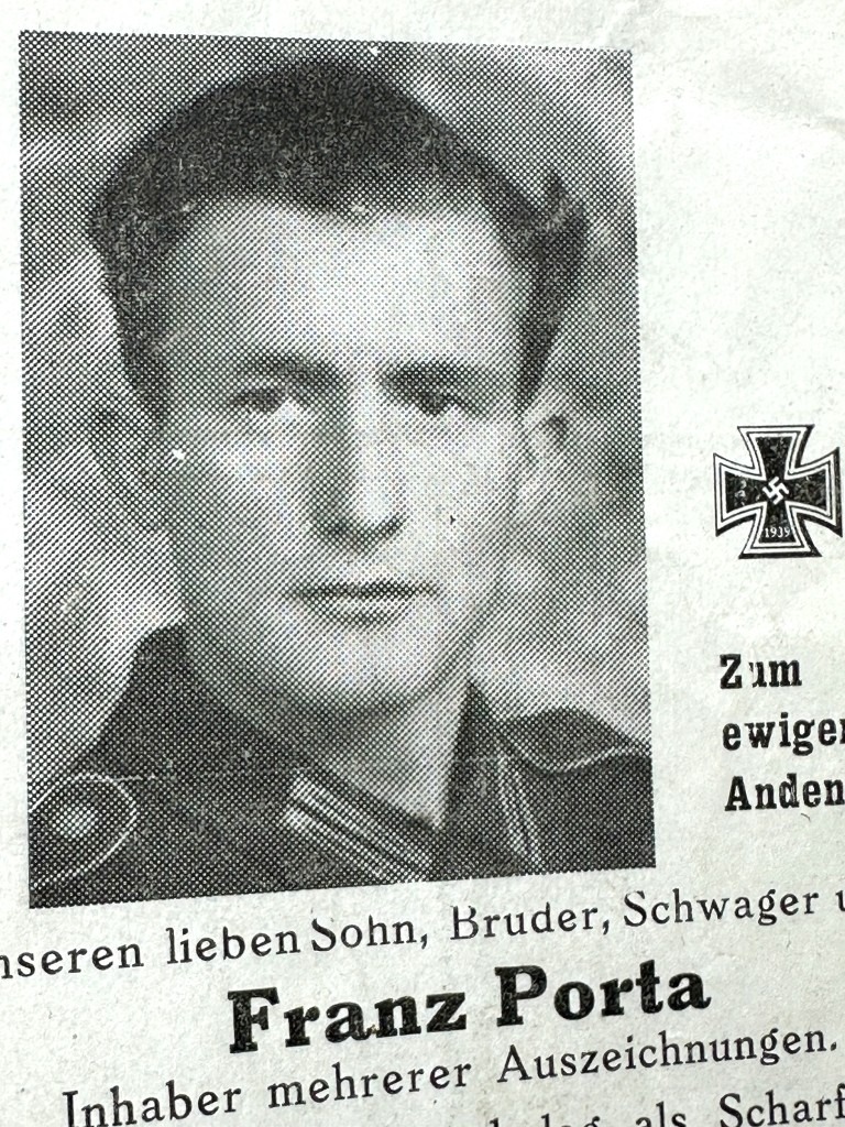 Franz Porta was born August 26, 1918 in Neukirchen and served in various units such as the Infanterie-Regiment 125, Marsch-Kp/Grenadier-Ersatz-Bataillon 118, Marschkompanie 560.