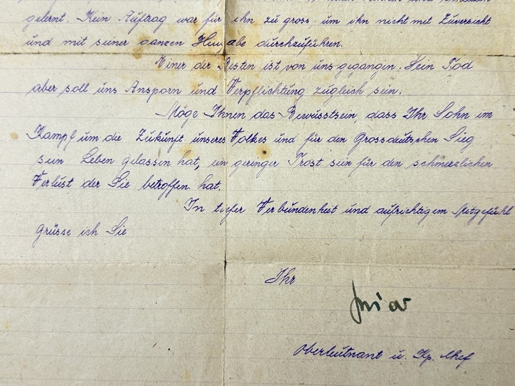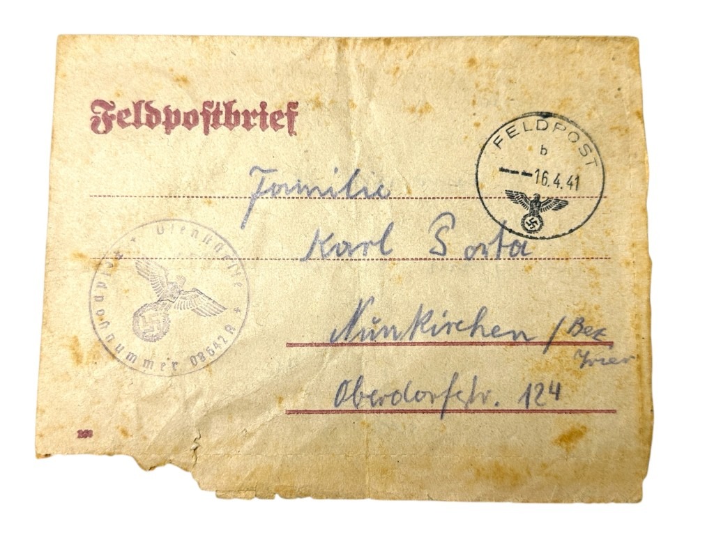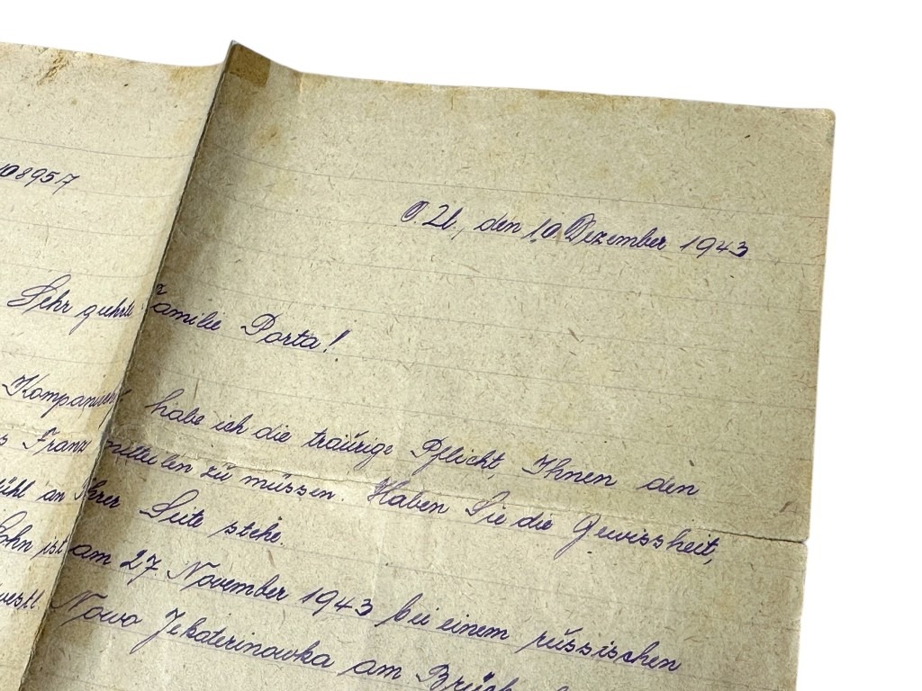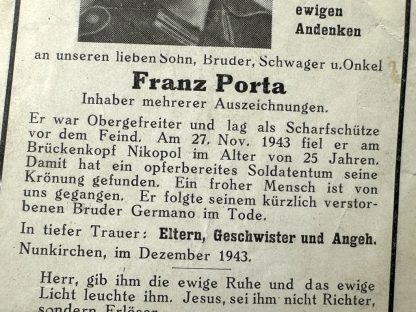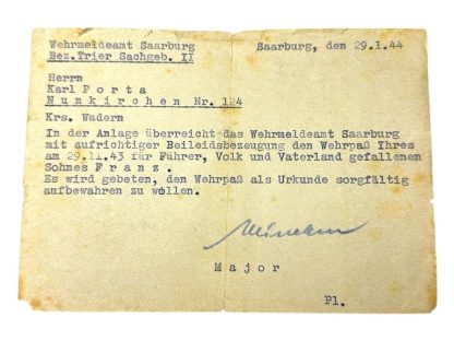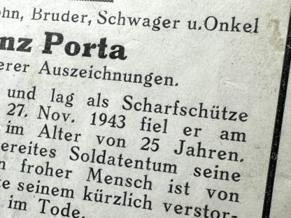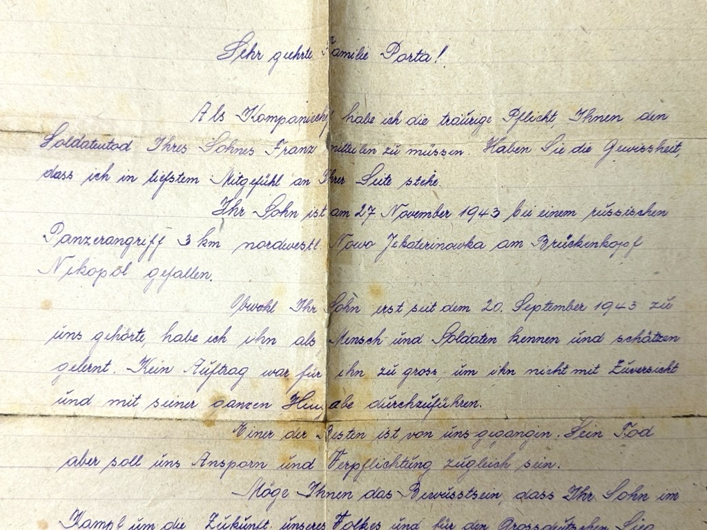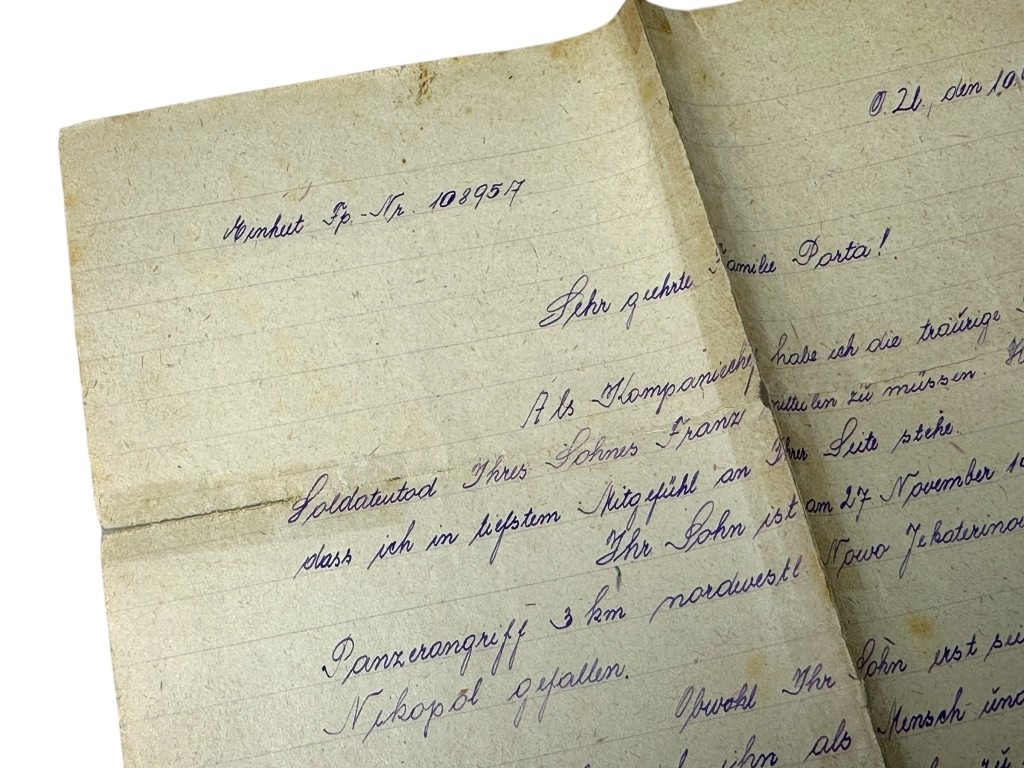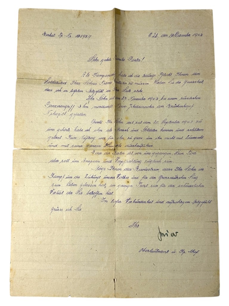 In this set is his Wehrpass, military death card, Scharfschutze training document, handwritten field mail letter from Franz, handwritten letter from his Oberleutnant telling about how he was killed (During a Russian tank attack), condolence card to the family, document regarding this Wehrpass from 1944.