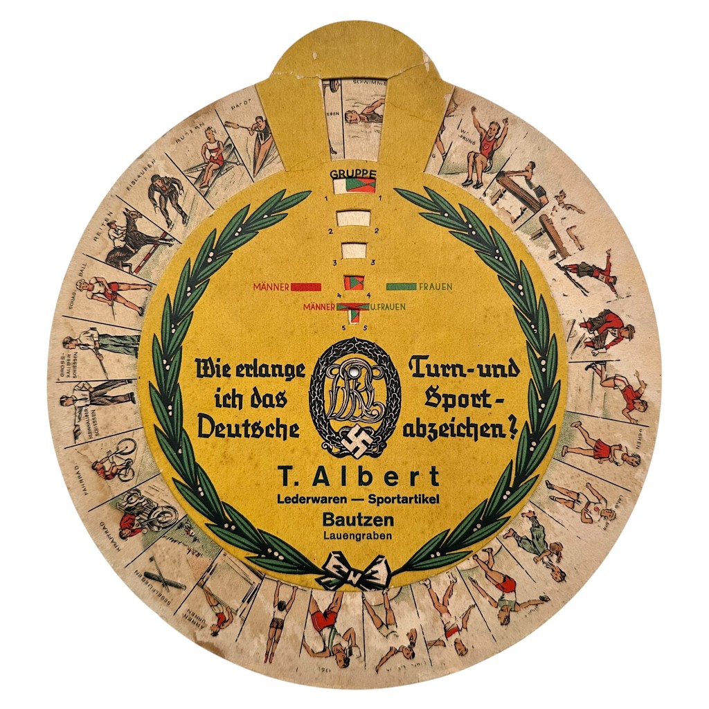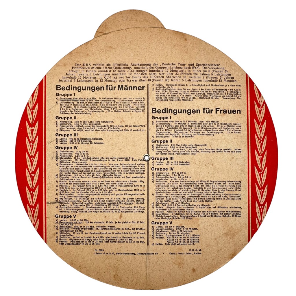 This beautifully designed cardboard rotating disc features colorful sports illustrations around the edge and provides, on the reverse, a comprehensive overview of the requirements for earning the German Gymnastics and Sports Badge, divided into different groups for men and women.